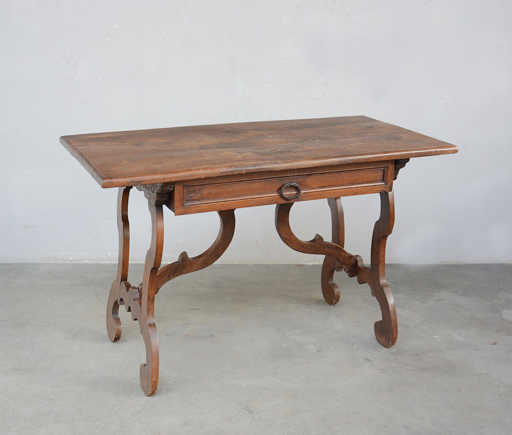 Antico tavolo "fratino" ad un cassetto sottopiano con gambe a lira riunite da traversa (cm 123x80x62) (difetti)