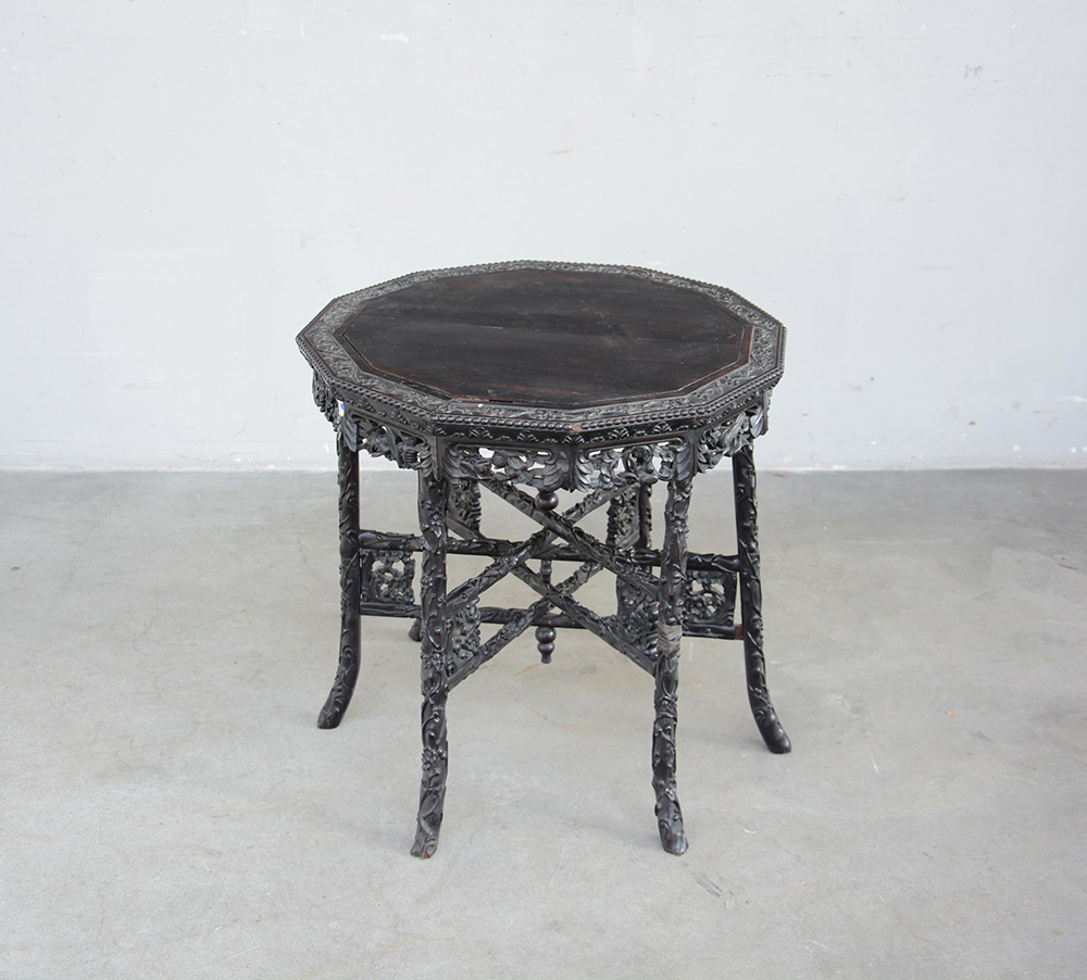 Tavolino con piano di forma dodecagonale in legno scolpito con motivi floreali (difetti) Cina, sec. XX (d.61 cm.)