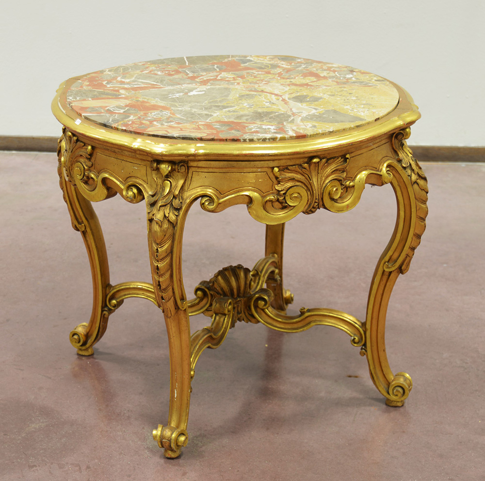 Tavolino tondo in legno intagliato e traforato a motivi vegetali e volute, gambe traverse sagomate, piano in marmo venato (d cm 80, h cm 67) (difetti)