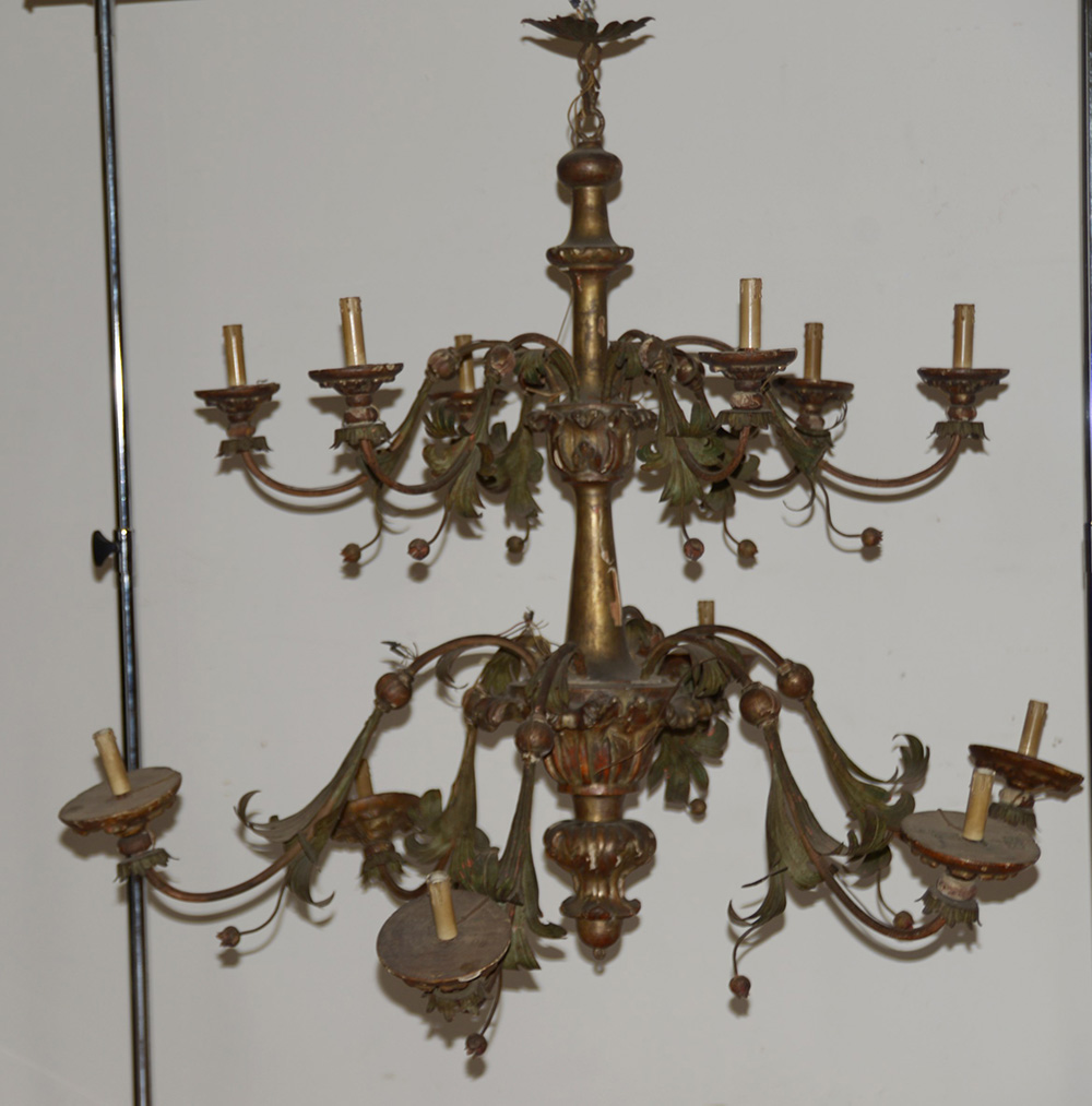 Lampadario a dodici fiamme in legno intagliato a motivi vegetali, braccia in ferro battuto decorato a foglie (h cm 110) (difetti)