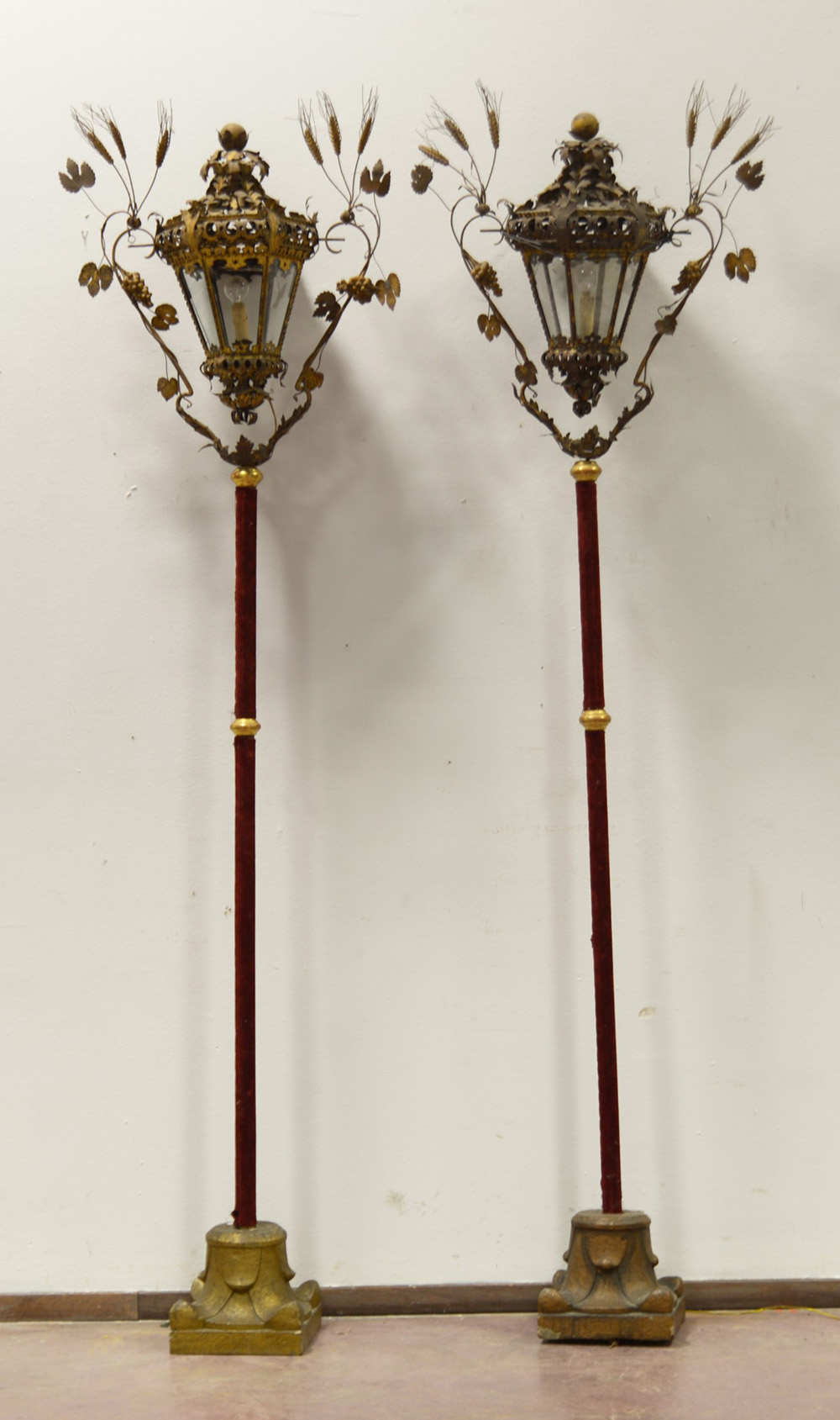 Coppia di lanterne da processione di forma esagonale in metallo dorato decorato a spighe, grappoli d'uva e motivi vegetali, sorrette da bastoni in legno tornito e dorato rivestito in velluto rosso, basi a forma di capitello (h cm 250) (difetti)