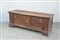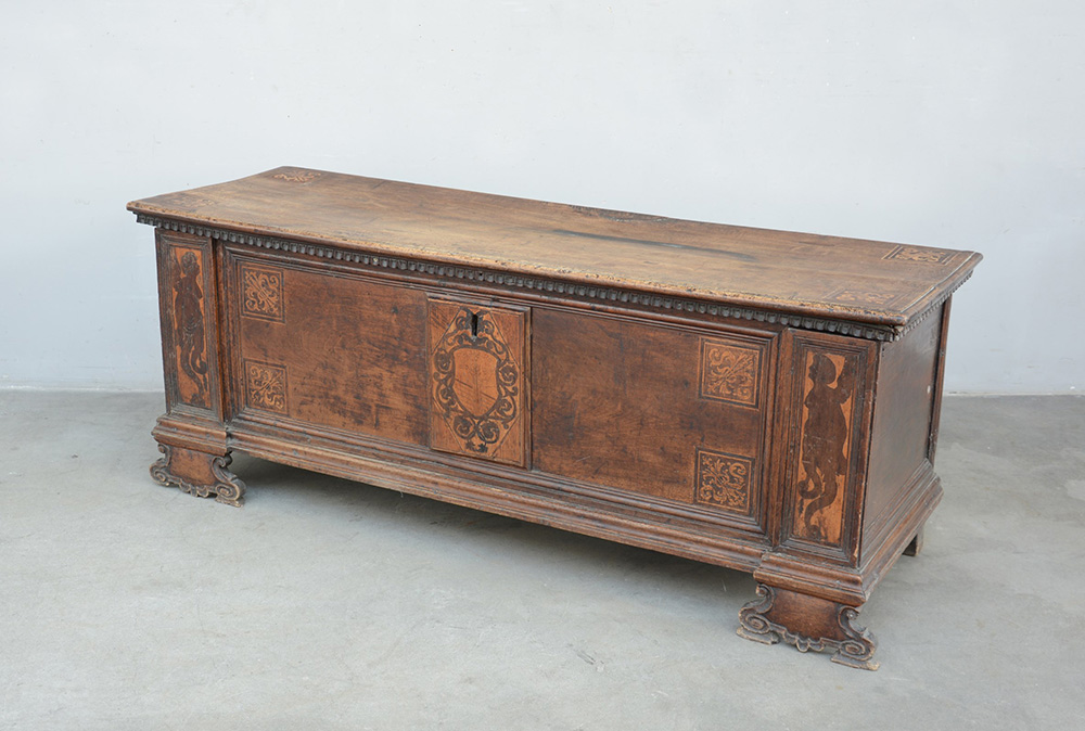Cassapanca in noce con fronte intarsiato a stemma centrale, volute e figure...