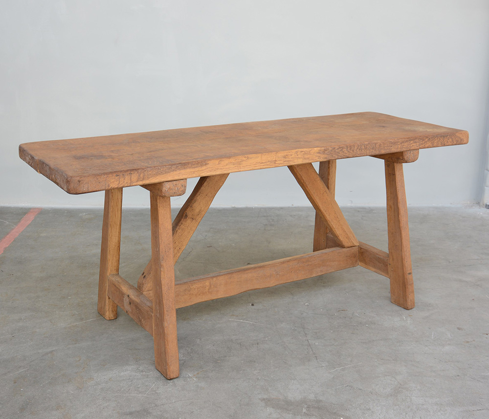 Tavolo a capretta con piano di forma rettangolare e gambe riunite da traverse dritte (cm 180x80x70) (difetti)