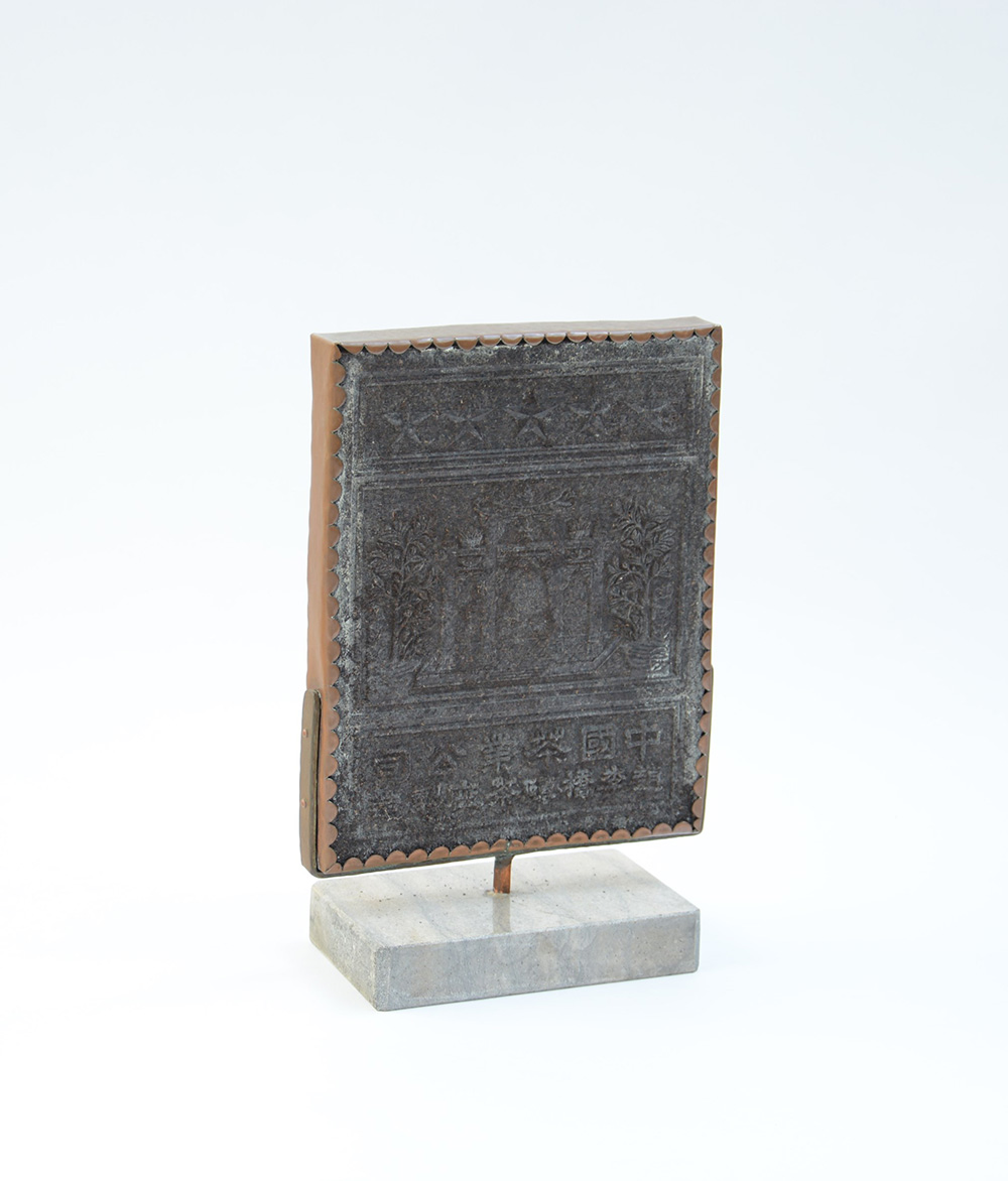 Formella di tè pressato montata su base in pietra dura con disegni geometrici e calligrafia (difetti)