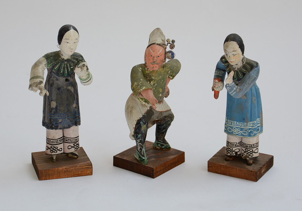 Manifattura orientale. Lotto composto da tre statuine in terracotta smaltata raffiguranti personaggi teatrali (difetti e mancanze)