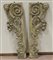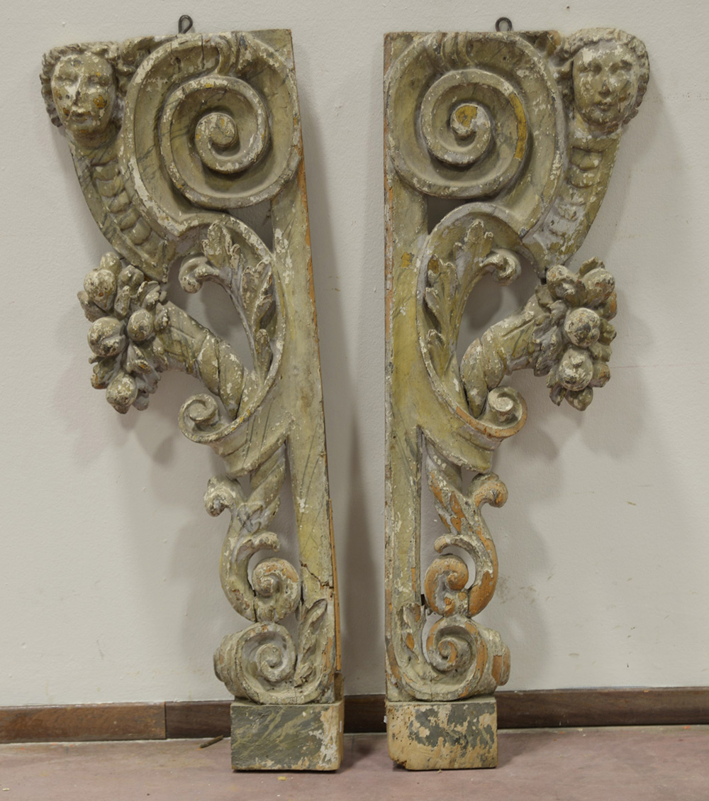 Coppia di antichi fregi in legno intagliato e laccato a motivi vegetali, cornucopie e teste di cherubini (h cm 110) (difetti)