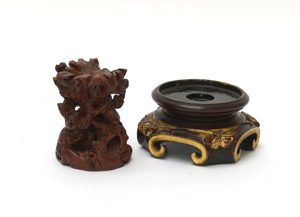 Lotto composto da due basi orientali in legno scolpito con dorature (difetti) Cina, sec. XX (h. max 10 cm.)