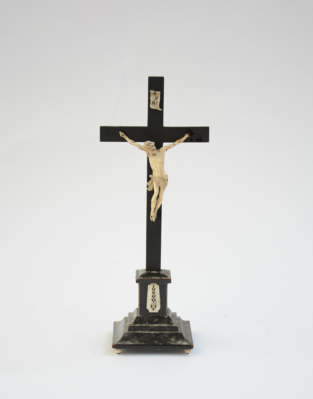Arte del sec. XIX. "Cristo crocifisso" scultura in avorio con base ebanizzata (h. cm 27)