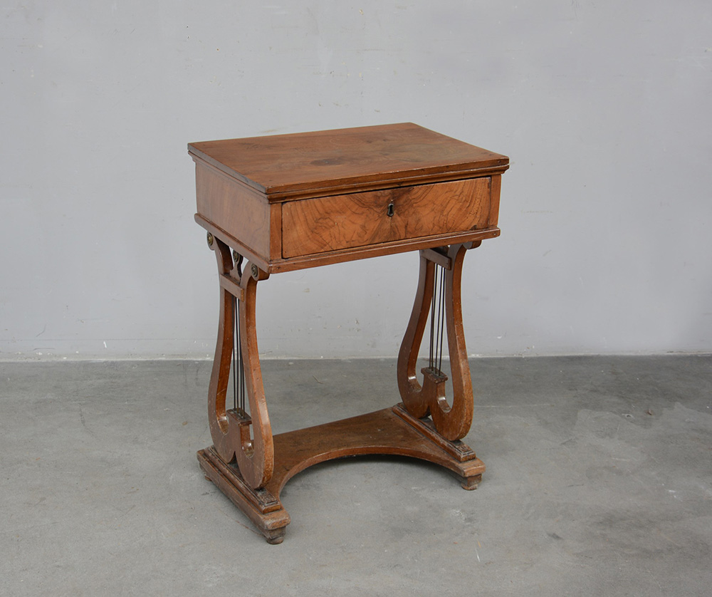 Tavolo da lavoro in noce ad un cassetto sottopiano. Gambe a lira riunite da pianetto. Sec. XIX (cm 54x76x39) (difetti)