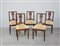 Gruppo di cinque sedie in noce con schienale di forma squadrata decorato a...