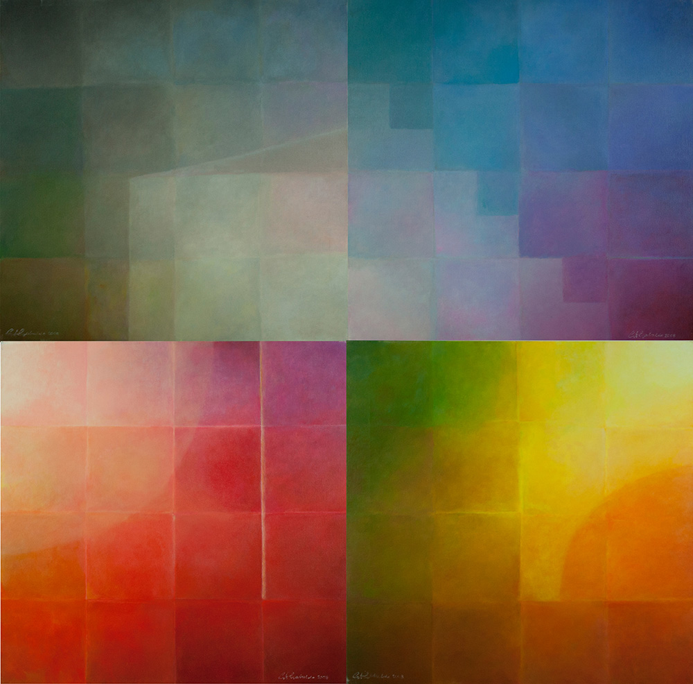 GIANFRANCO GABALDO Bologna, 1960 " Apocalittico " anno 2008 olio su tela polittico composto da 4 pz cm 60x60 cad. (120x120 cm tot.) firmati al fronte e al retro Autentica del Maestro