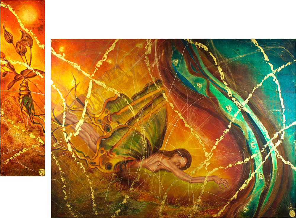 MARIA GIACOBBE Messina, 1960 " Metamorfosi " anno 2007 olio su tavola su fondo foglia oro dittico composto da 110x80 + 20x80 firmato al fronte e al retro