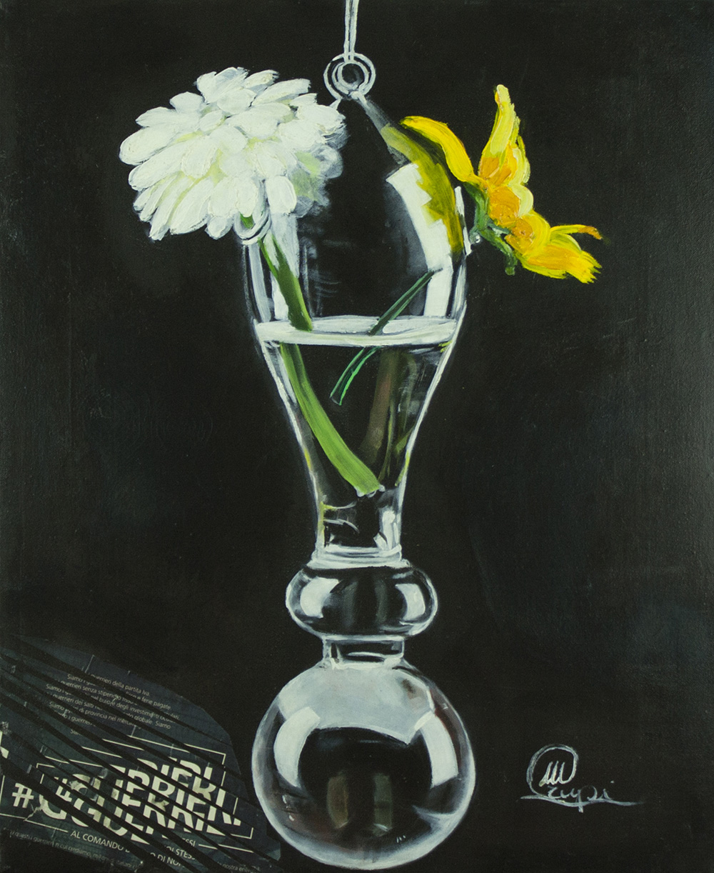MILENA CRUPI Rossano, 1960 " Riflessi " serie vetri e cristalli anno 2017 olio su tela e giornali 50x40 cm firmato al fronte; al retro titolo,anno e firma " Percorso stellare " 2005 Smalti su faesite 30x60 firmato e datato al retro