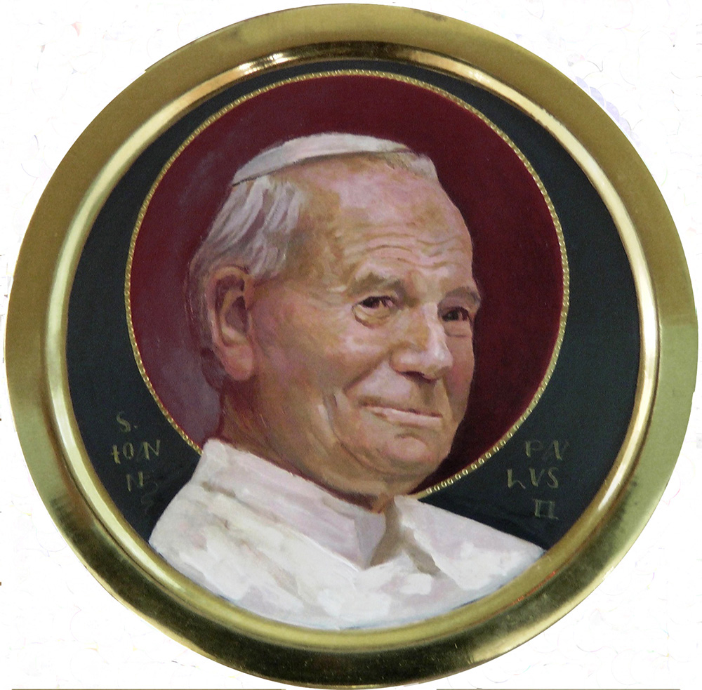 STEFANOS ARMAKOLAS Tinos " Giovanni Paolo II " olio e oro zecchino su tavola Ø 24,5 cm Certificato del Maestro