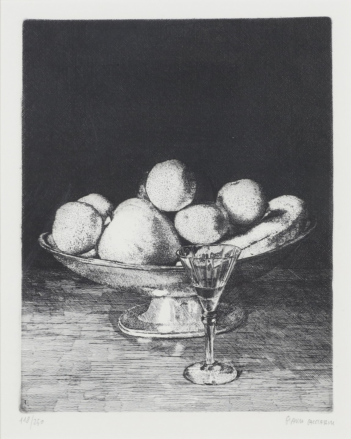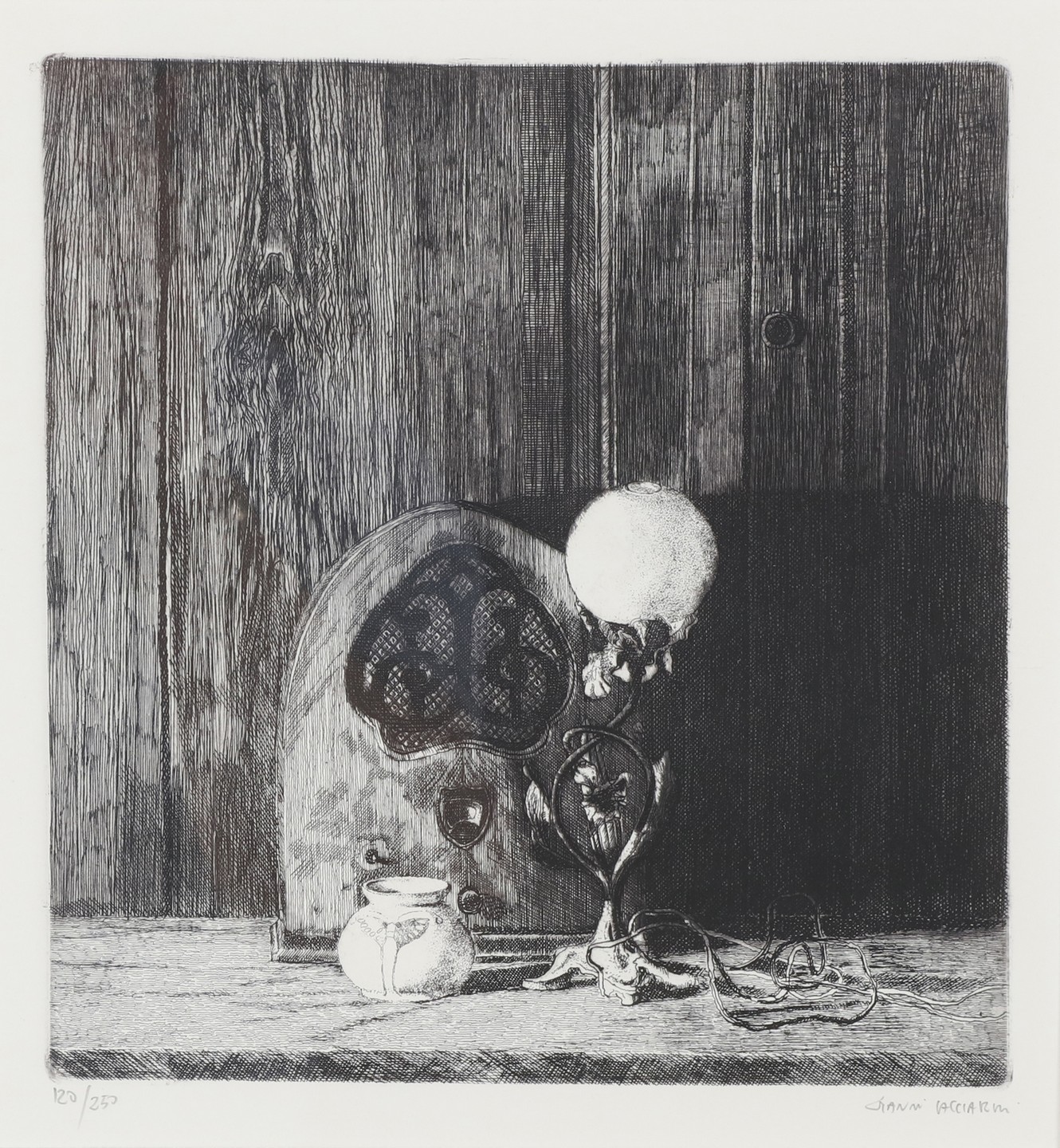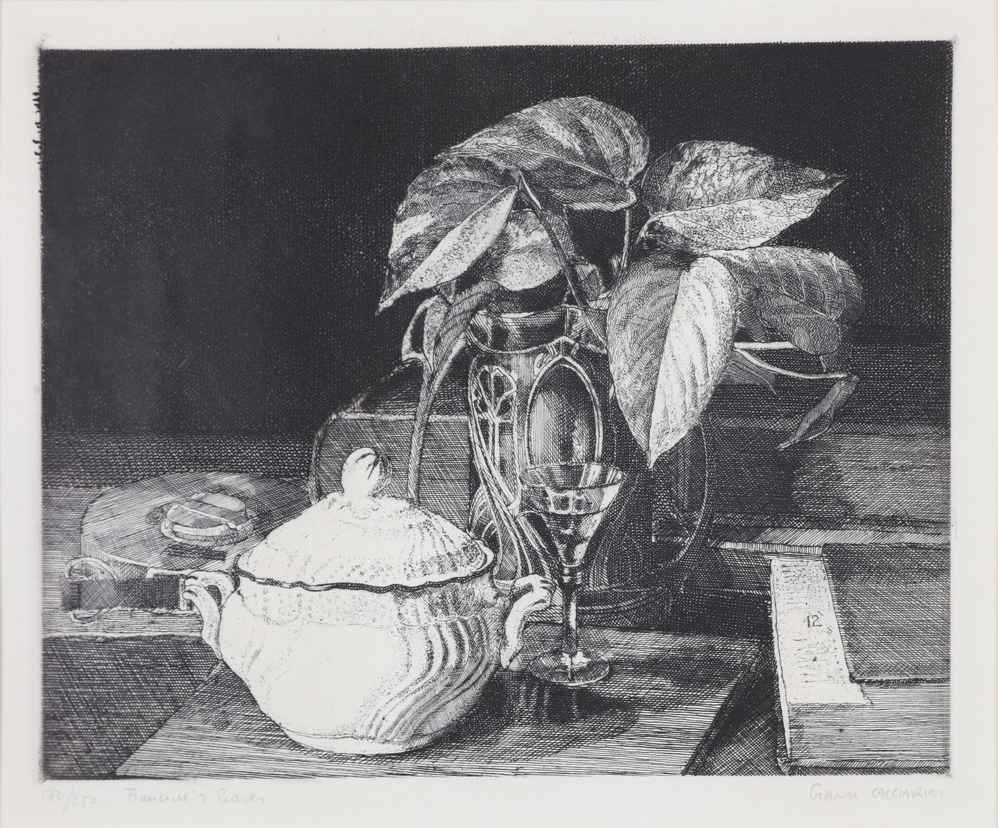 CACCIARINI GIANNI (n. 1941) Lotto comprendente n.4 fogli. Acquaforte. Cm 35,00 x 45,00. Dimensioni e tiratura: 1) 20,5x19,5 (120/250 Natura morta con lampada); 2) 15,5x22 /64/250 The rose and the ring); 3)17,5x22 (172/250 Francine's leaves); 4) 22,5x18,5 (118/250 Natura morta con bicchiere). Tutte le opere sono firmate e numerate in basso a matita. Cornice presente