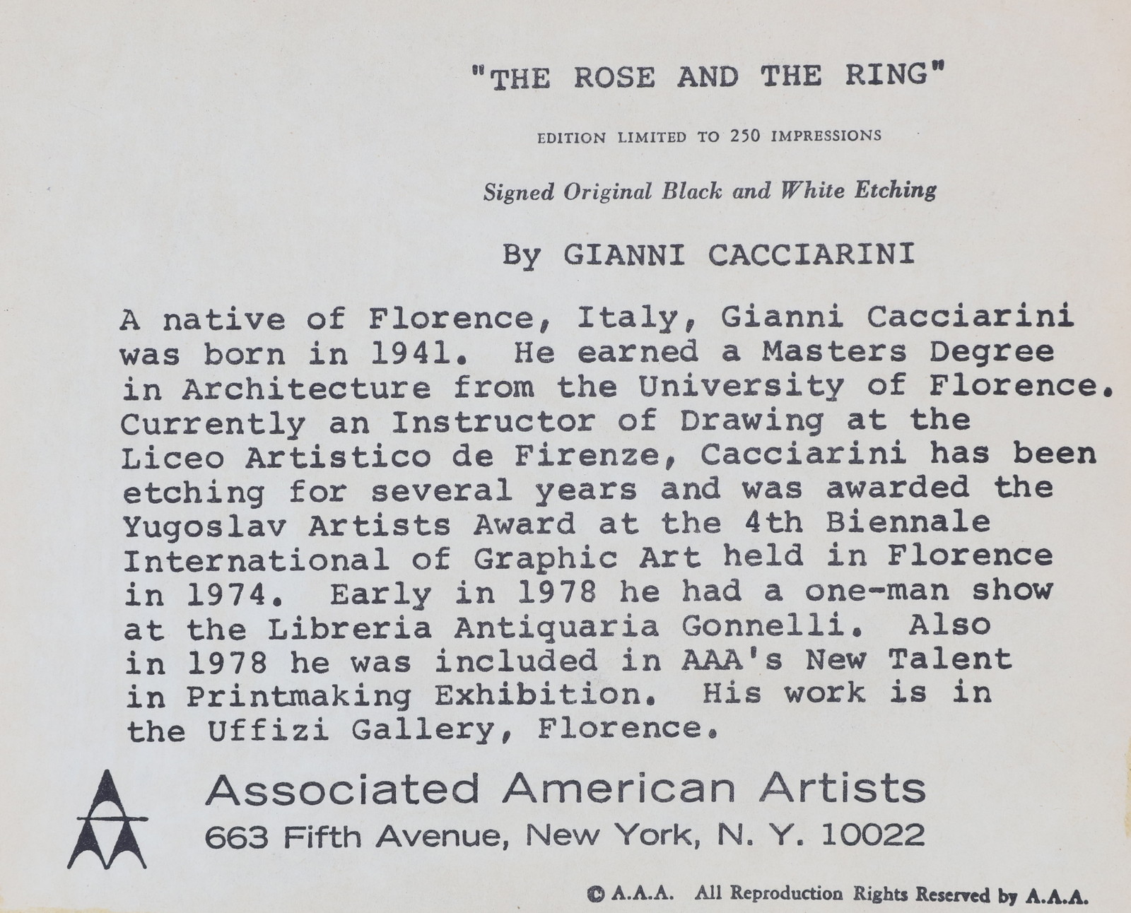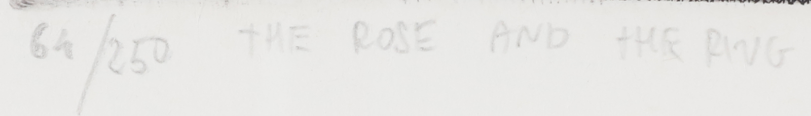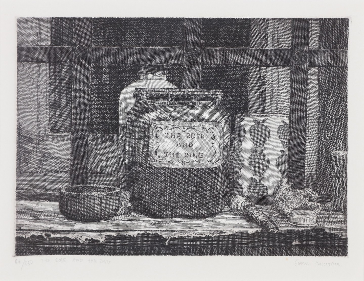 CACCIARINI GIANNI (n. 1941) Lotto comprendente n.4 fogli. Acquaforte. Cm 35,00 x 45,00. Dimensioni e tiratura: 1) 20,5x19,5 (120/250 Natura morta con lampada); 2) 15,5x22 /64/250 The rose and the ring); 3)17,5x22 (172/250 Francine's leaves); 4) 22,5x18,5 (118/250 Natura morta con bicchiere). Tutte le opere sono firmate e numerate in basso a matita. Cornice presente