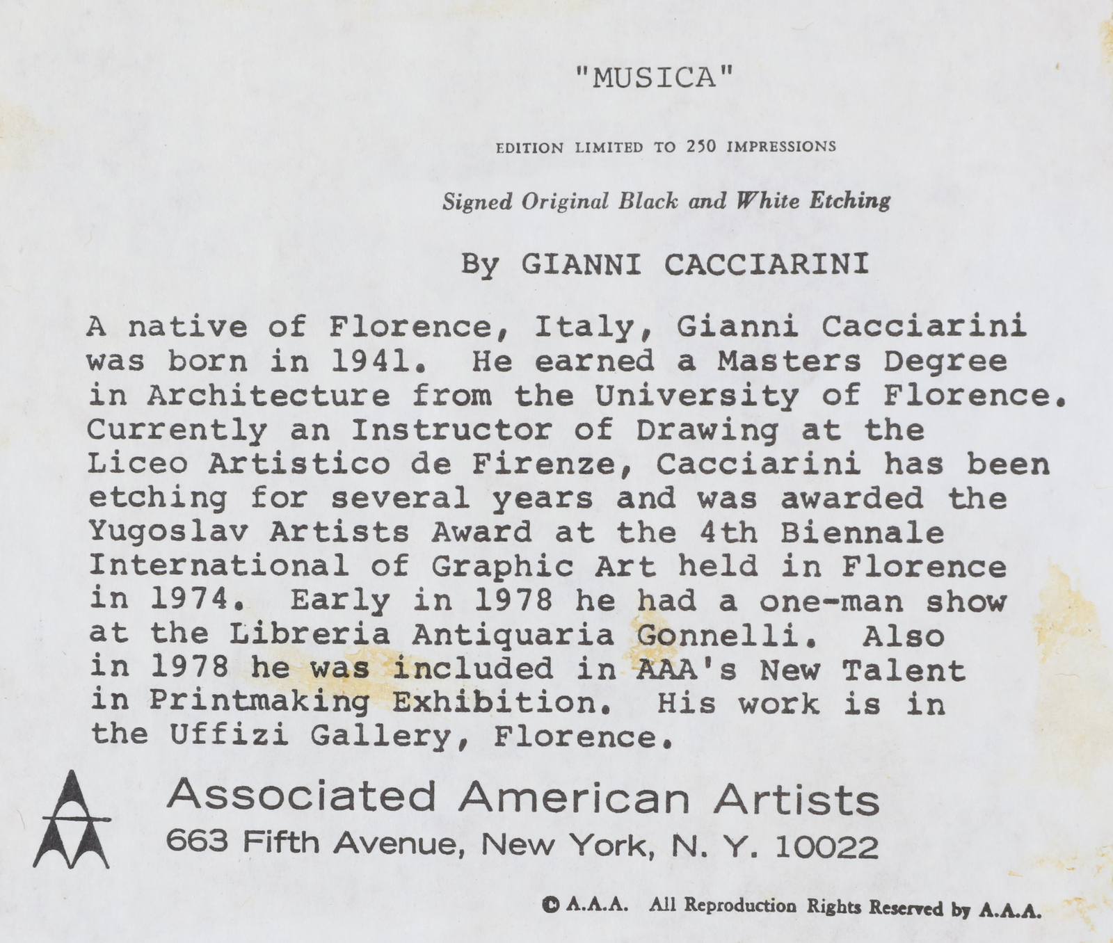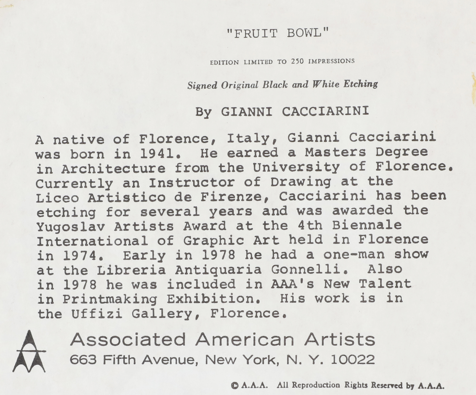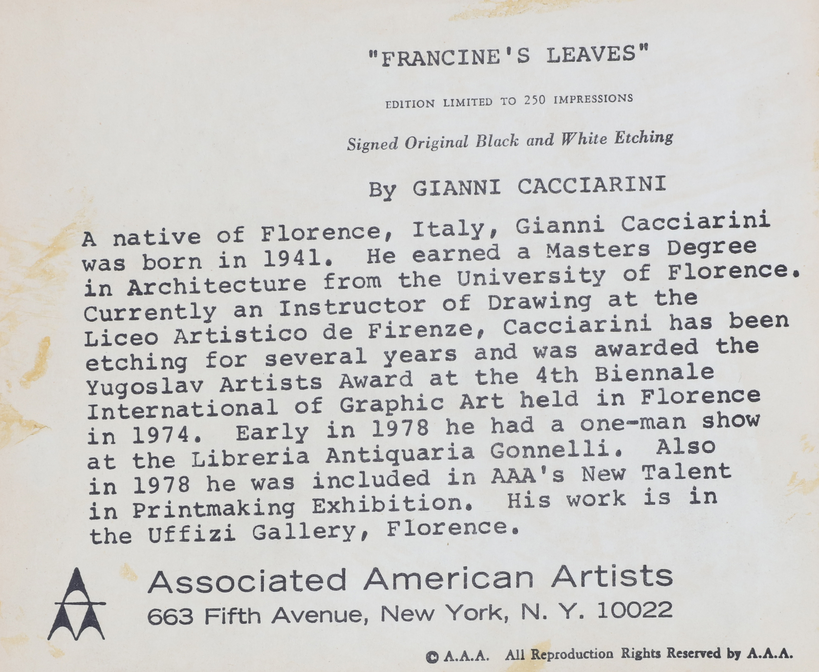 CACCIARINI GIANNI (n. 1941) Lotto comprendente n.4 fogli. Acquaforte. Cm...