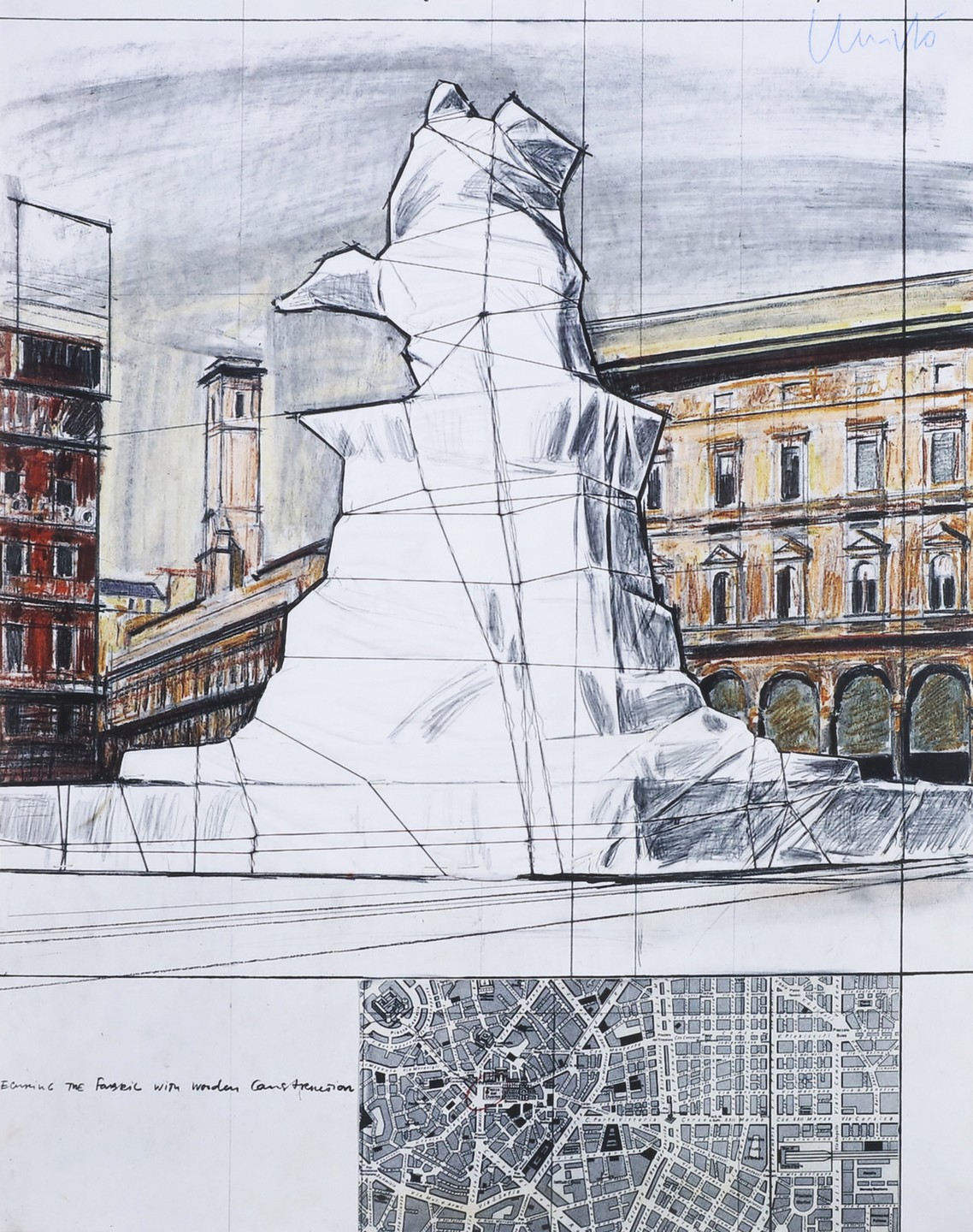 CHRISTO (n. 1935) Wrapped monuments to Vittorio Emanuele II, Piazza del Duomo, Milan. Photograph. Cm 20,00 x 26,00. Signature upper right.