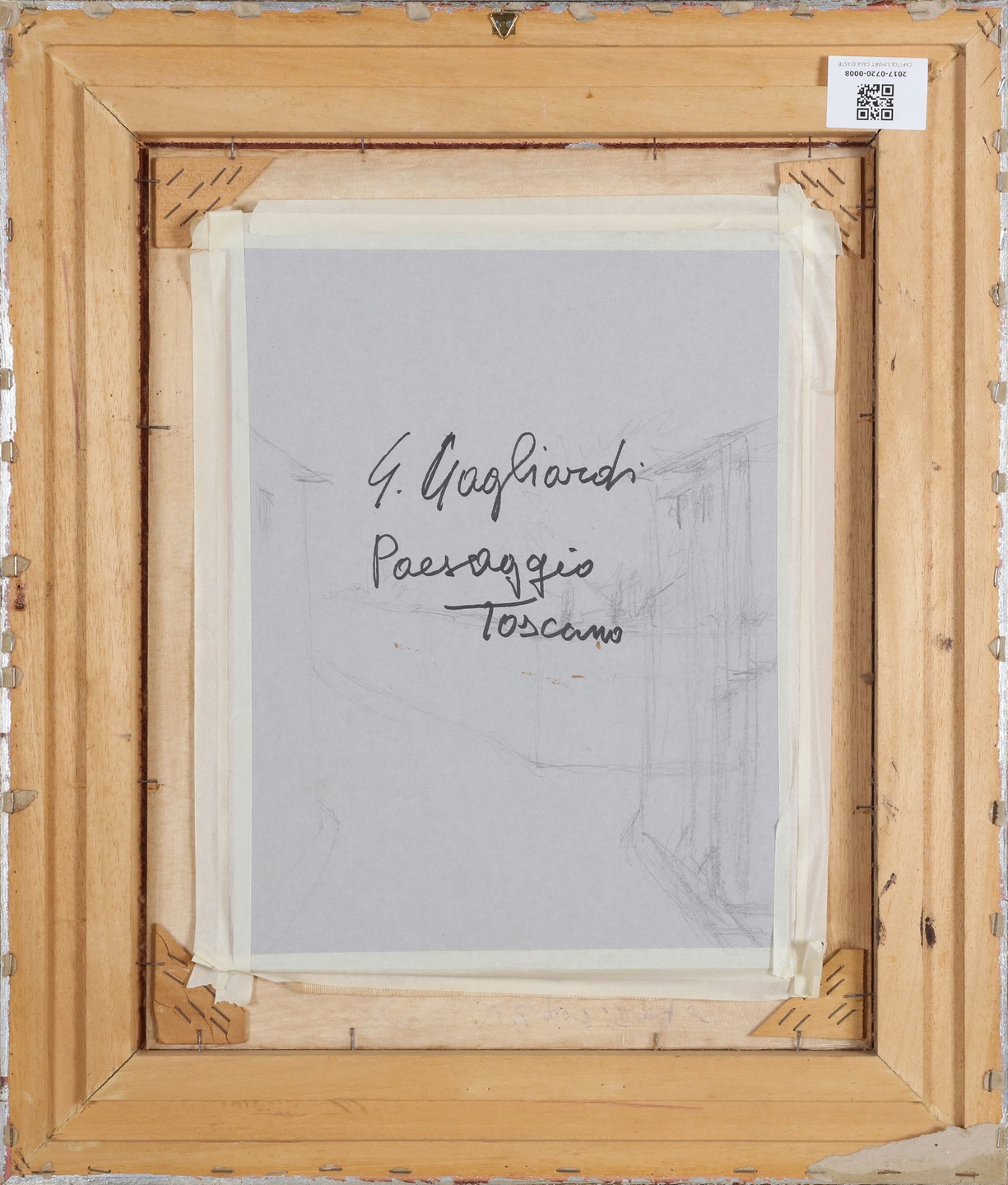 GAGLIARDI GIUSEPPE (n. 1896) Lotto composto da n. 2 opere. Paesaggio toscano. Olio su cartone. Cm 50,00 x 40,00. Entrambe le opere riportano la firma al retro. Dimensioni seconda opera: 40x30 cm. Firma in basso a destra. Al retro titolo. . Cornice presente