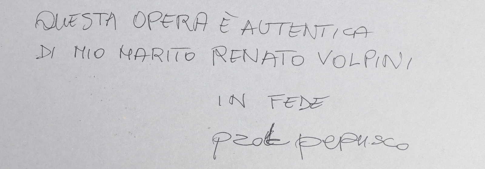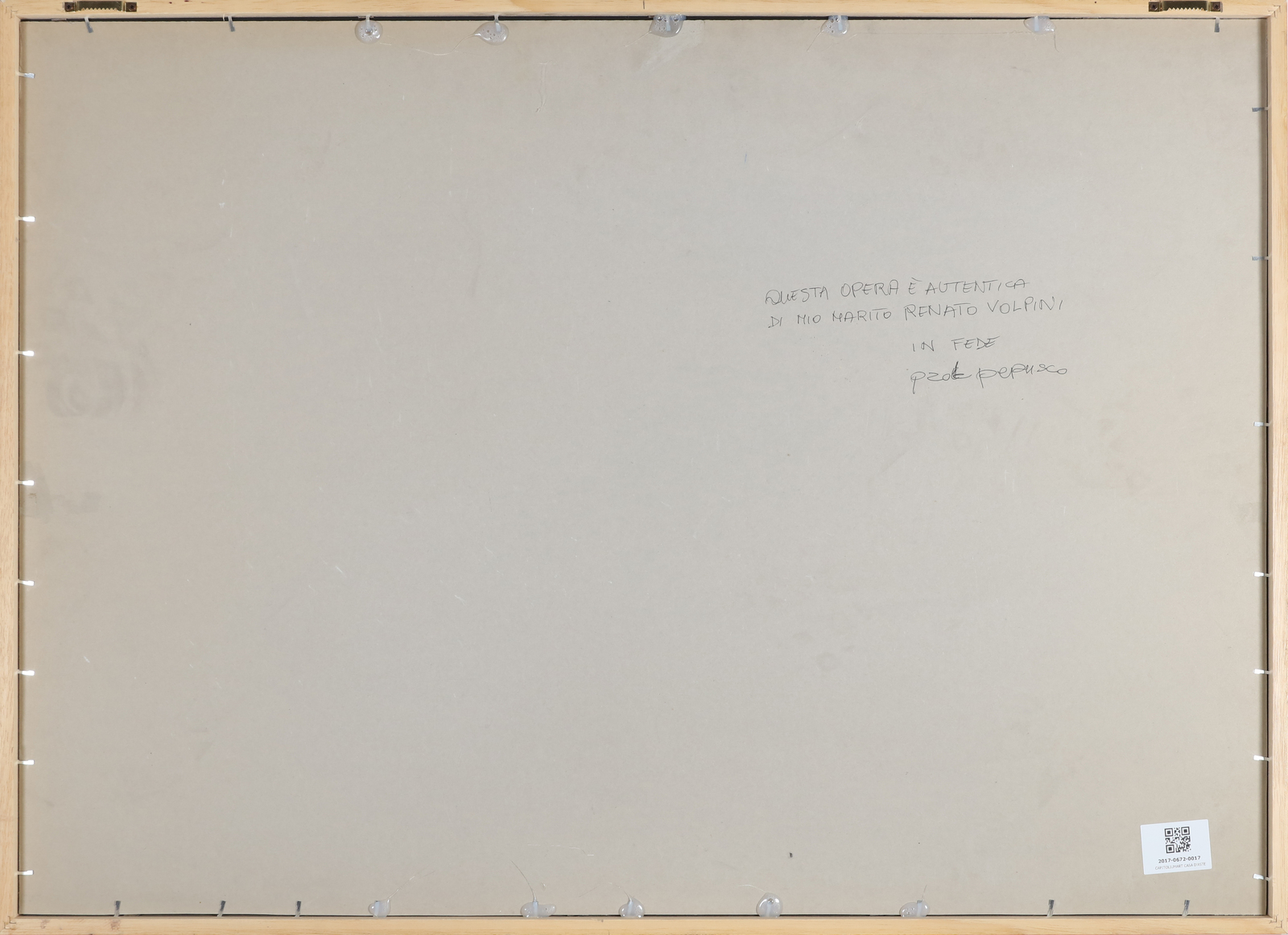 VOLPINI RENATO (n. 1934) Senza titolo. 1970. Tecnica mista su cartone. Cm 95,00 x 70,00. Firma e anno in basso a destra. Al retro dichiarazione di autenticità della moglie dell'artista. Cornice presente