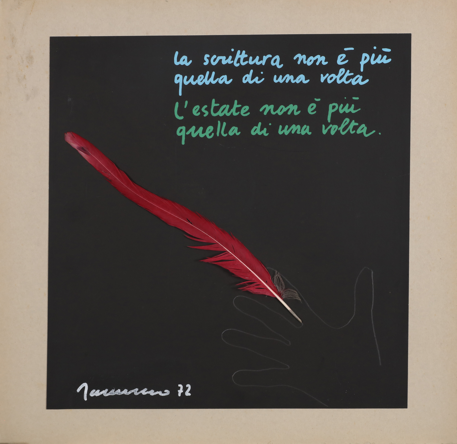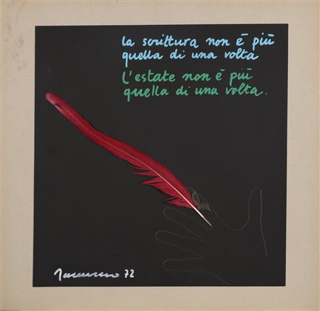 SARENCO (ISAIA MABELLINI) (n. 1945) La scrittura non è più quella di una volta. L'estate non è più quella di una volta. 1972. Tecnica mista e collage su carta. Cm 36,00 x 38,00. Titolo in alto a destra. Firma e anno in basso a sinistra. Cornice presente