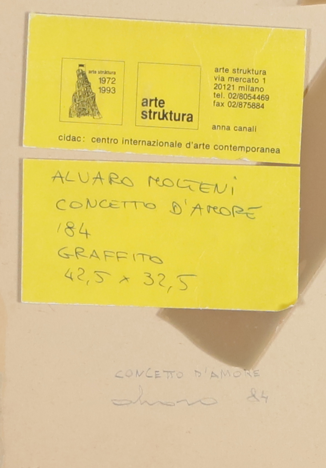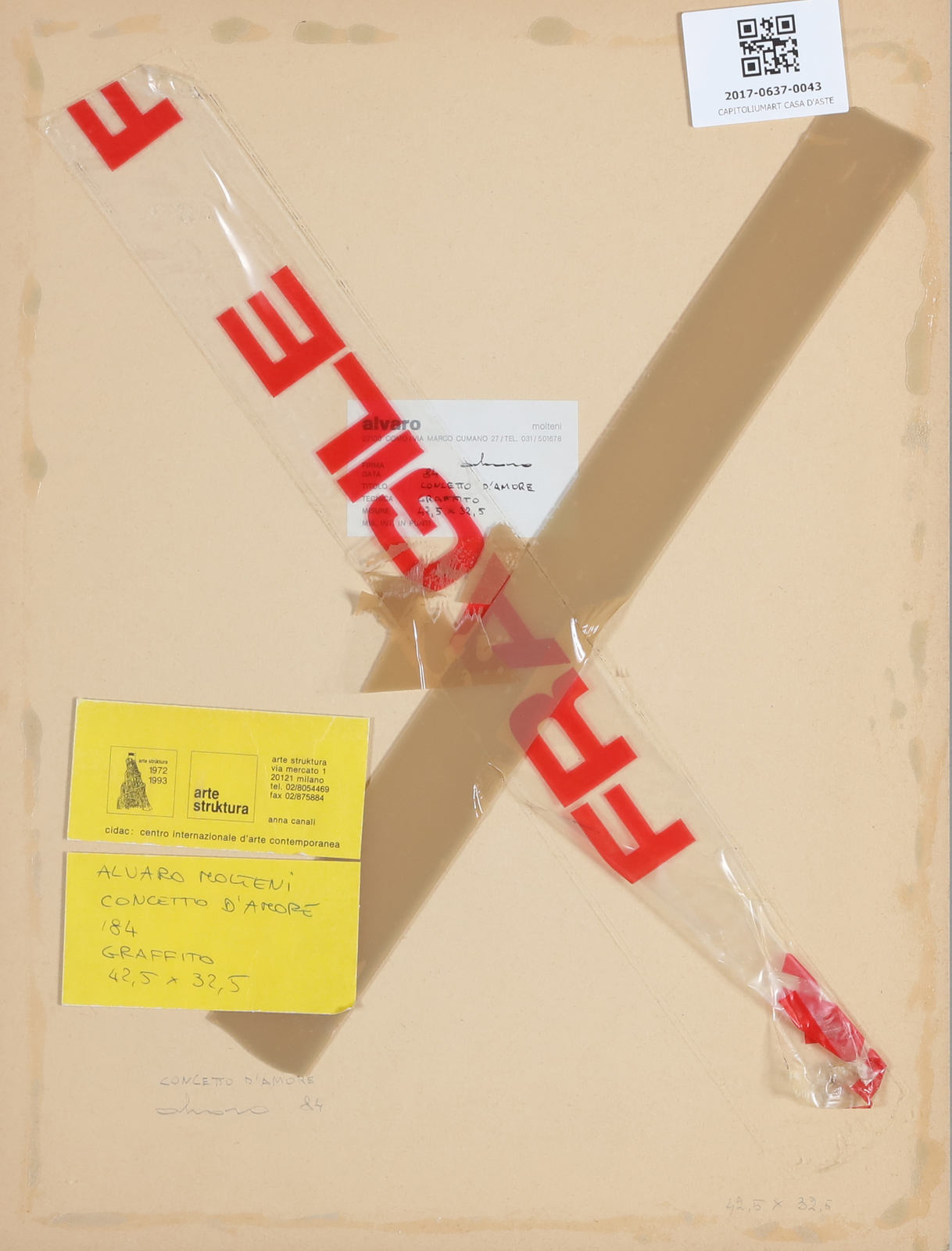 MOLTENI ALVARO (n. 1920) Concetto d'amore. 1984. Tecnica mista su cartoncino. Cm 32,00 x 42,00. Al retro titolo, firma, anno, cartiglio descrittivo Alvaro Moltemi , Como e cartiglio descrittivo Arte Struktura, Milano. Cornice presente
