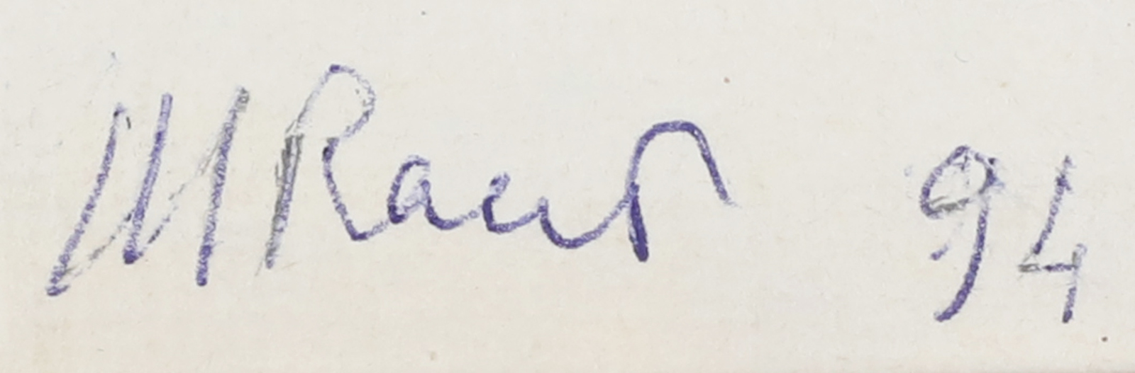 RACITI MARIO (n. 1934) Mystery. 1994. Mixed media on canvas paper. Cm 59,50 x 50,20. Signature and year lower right. At the back title, signature and year. Artist's authenticity certificate on photo.. Cornice presente