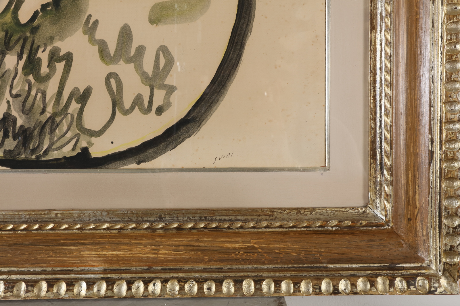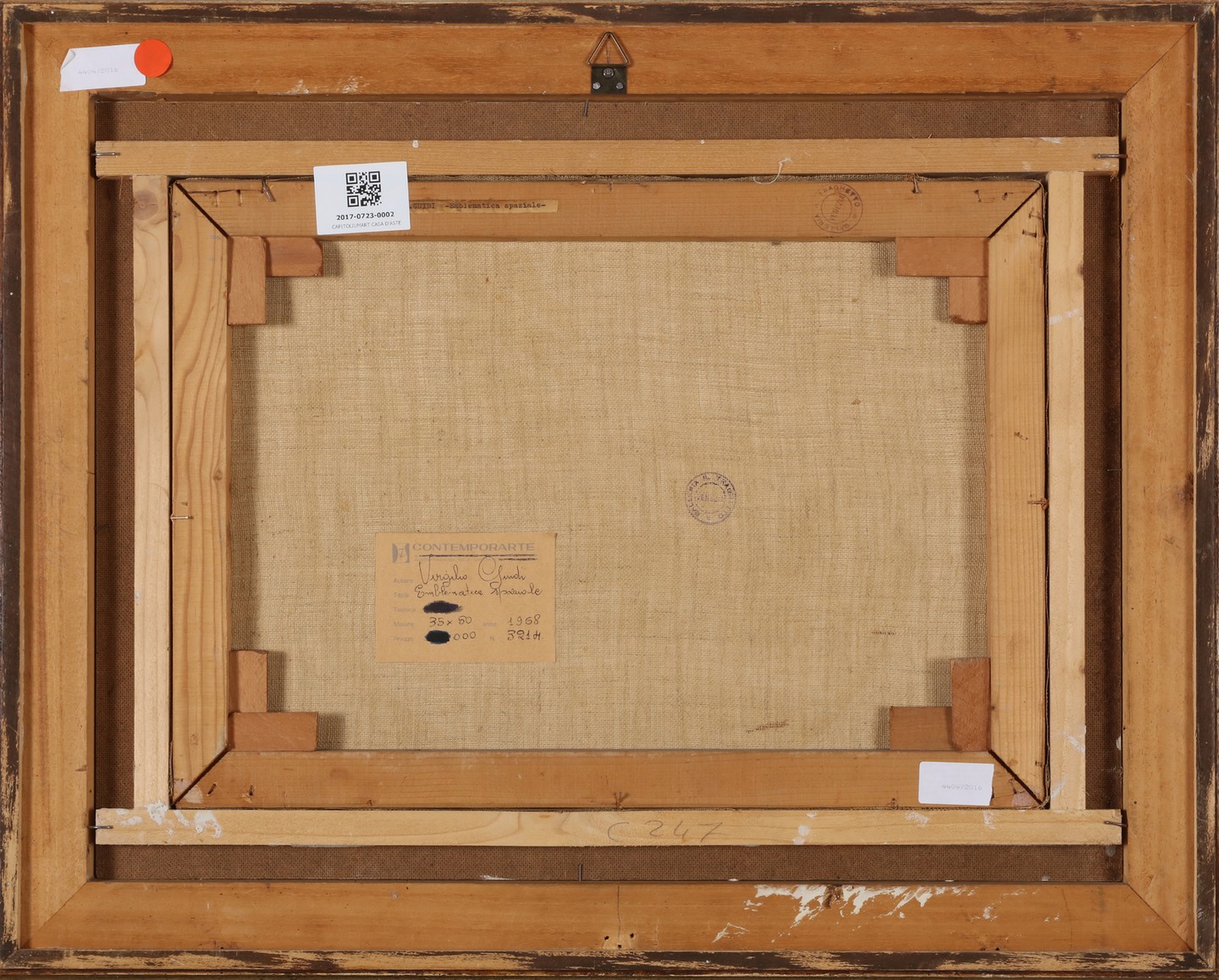 GUIDI VIRGILIO (1891 - 1994) Emblematica spaziale. . 1968. Tempera su carta applicata su tela. Cm 50,00 x 35,00. Firma in basso a destra. Al retro cartiglio descrittivo Contemporarte e timbro Galleria Il Traghetto, Venezia. Provenienza: Galleria Il Traghetto, Venezia. Cornice presente