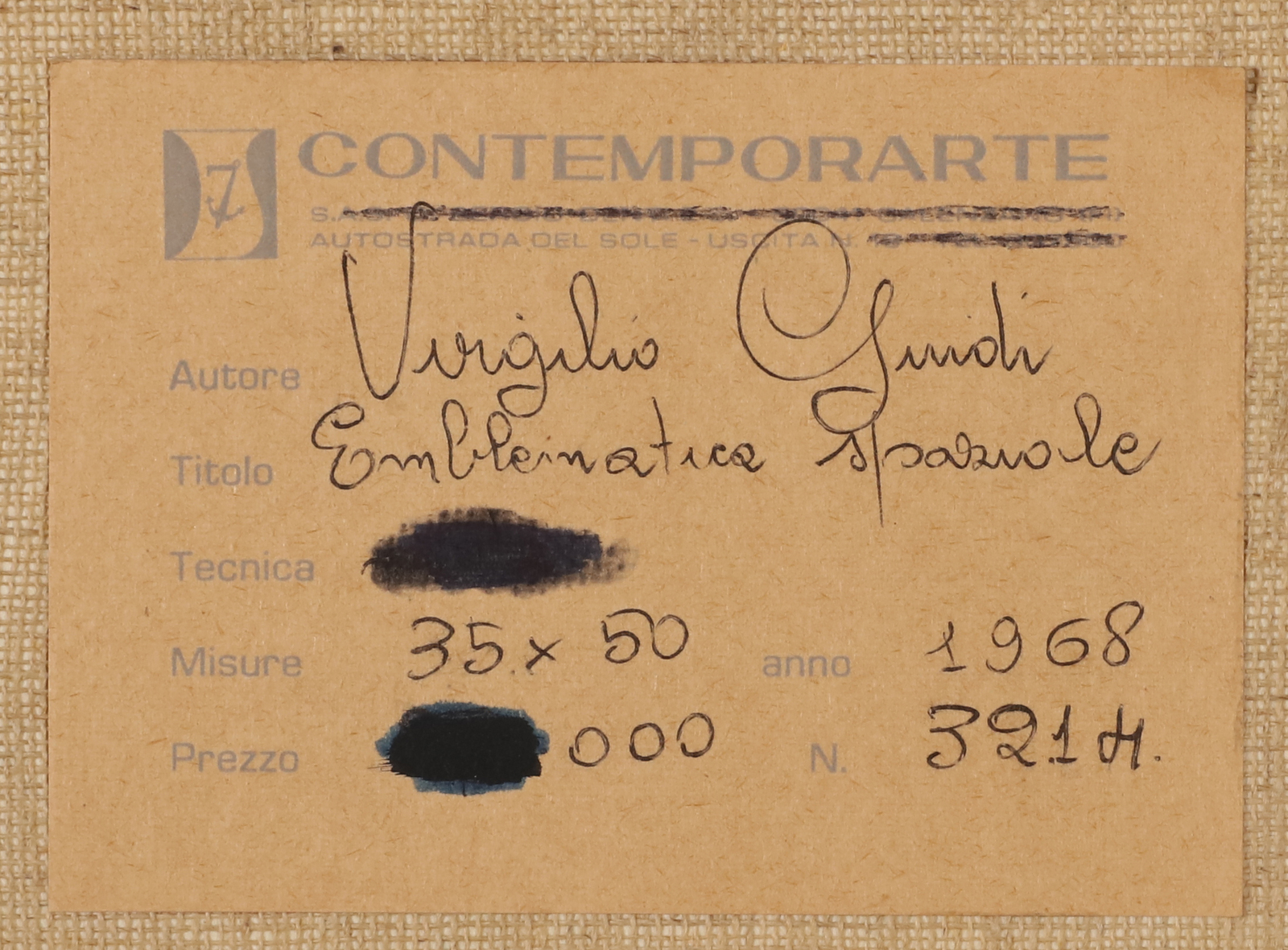 GUIDI VIRGILIO (1891 - 1994) Emblematic space. 1968. Tempera on paper mounted on canvas. Cm 50,00 x 35,00. Signature lower right. At the back Contempor art’s descriptive label with Traghetto Gallery , Venice stamp. Provenance: Traghetto Gallery, Venice.