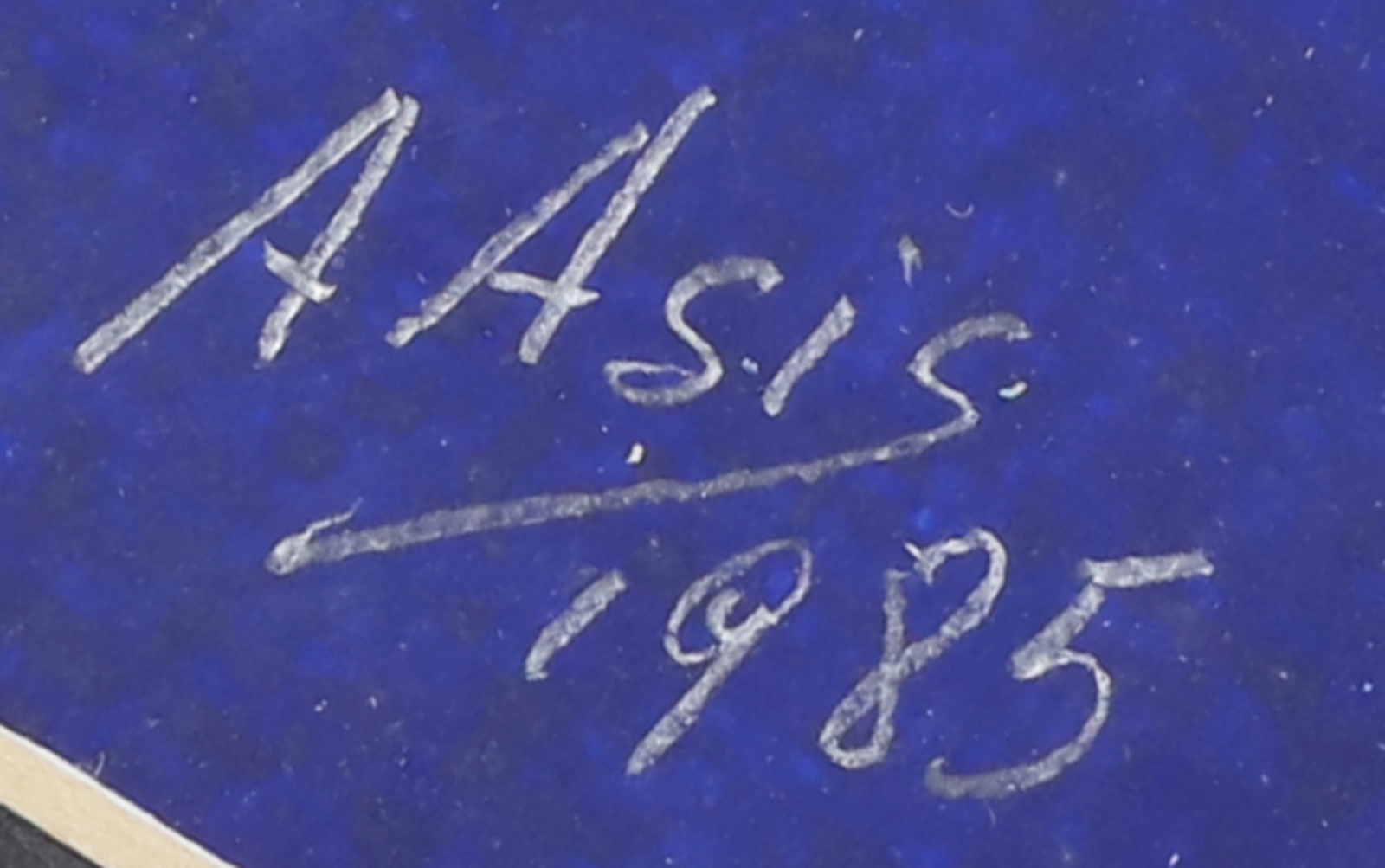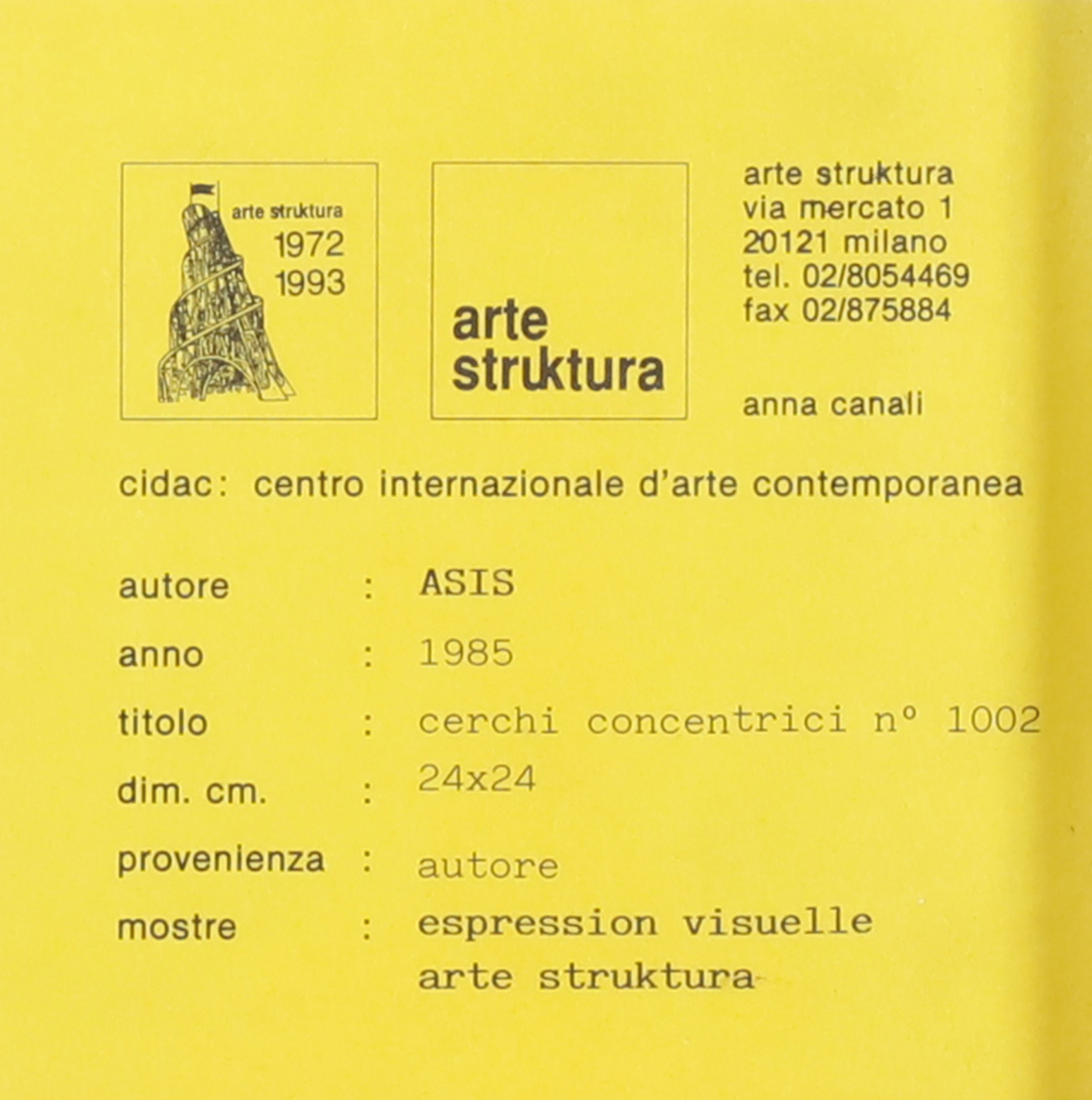 ASIS ANTONIO (n. 1932) Cerchi concentrici n.1002. 1985. Acrilico su cartone. Cm 24,00 x 24,00. Firma e anno in basso a destra. Al retro cartiglio descrittivo Arte Struktura, Milano e cartiglio descrittivo dell'artista. Cornice presente