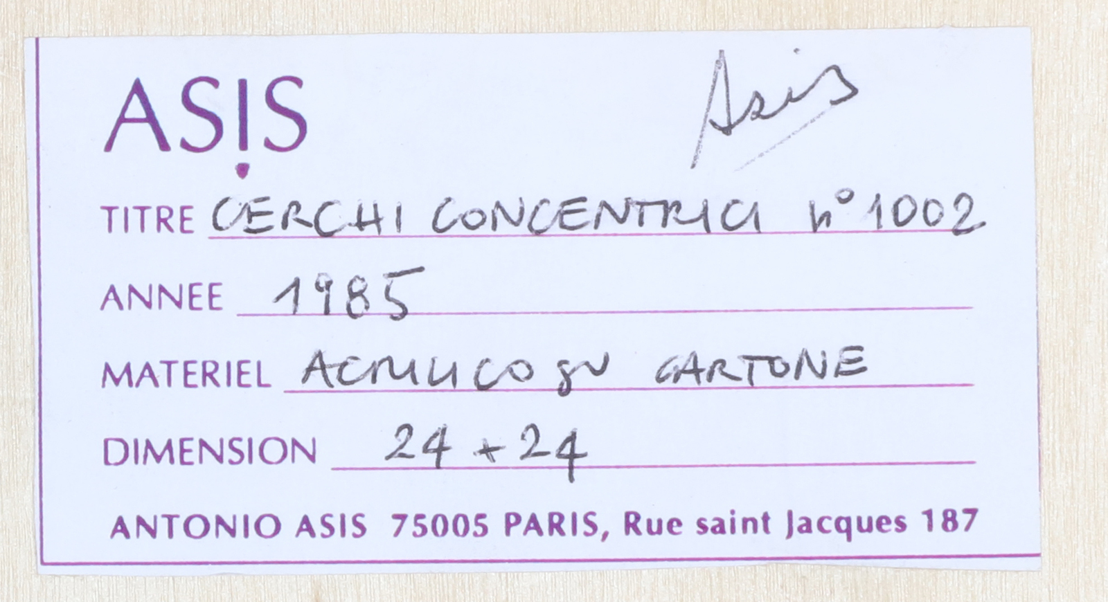 ASIS ANTONIO (n. 1932) Concentric circles n.1002. 1985. Acrylic on cardboard. Cm 24,00 x 24,00. Signature and year lower right. At the back Arte Struktura, Milan and artist’s labels.