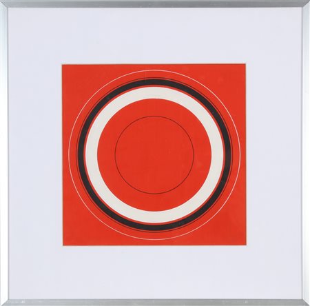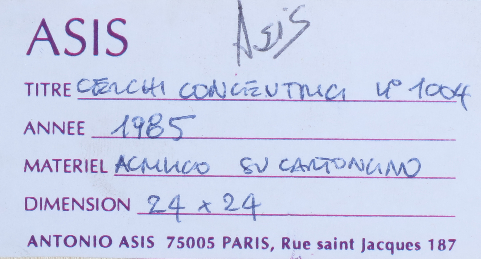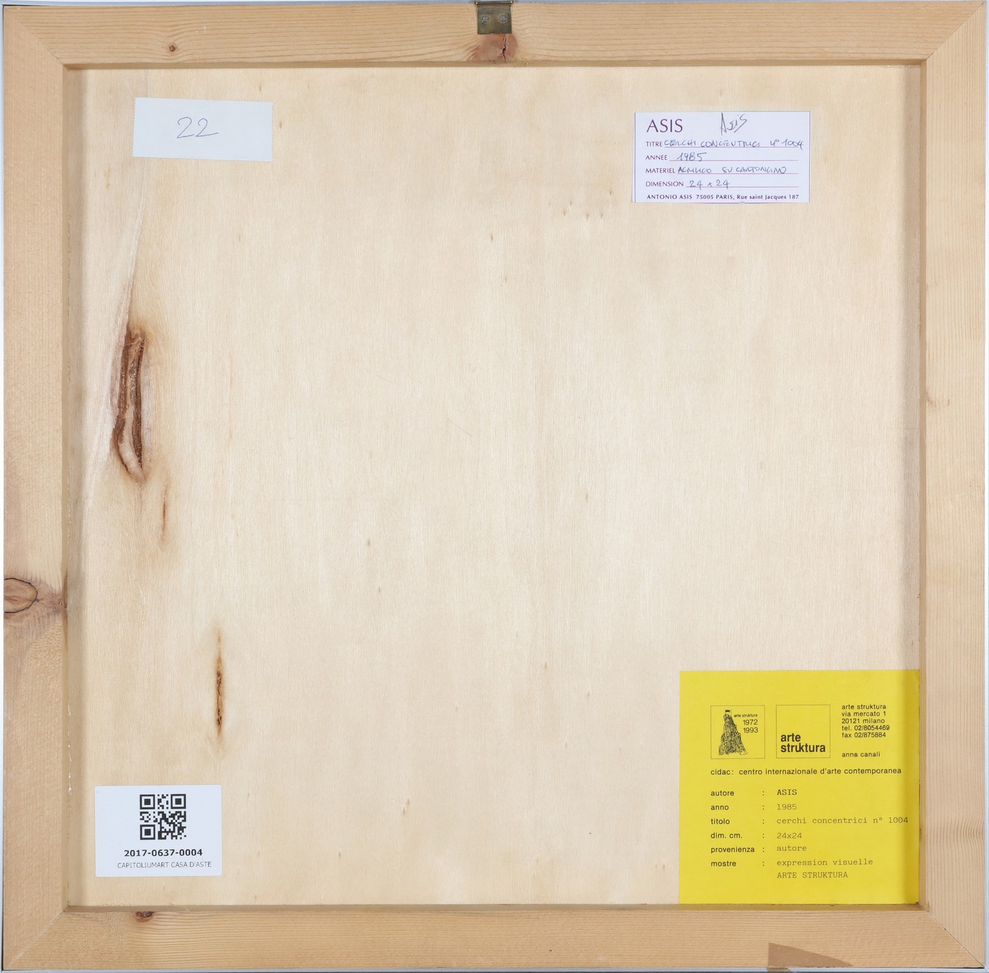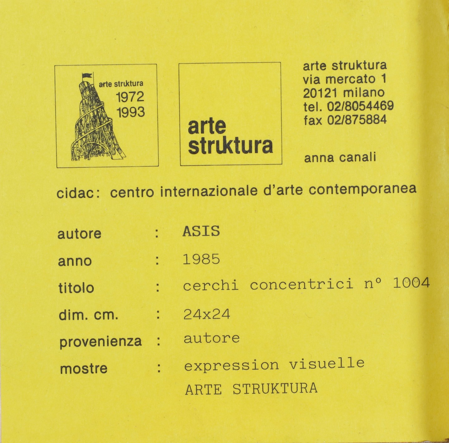 ASIS ANTONIO (n. 1932) Cerchi concentrici n.1004. 1985. Acrilico su cartoncino. Cm 24,00 x 24,00. Firma e anno in basso a destra. Al retro cartiglio descrittivo Arte Struktura, Milano e cartiglio descrittivo dell'artista. Cornice presente