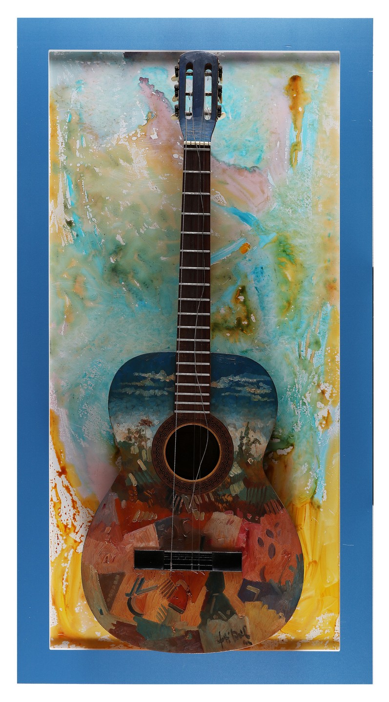 MANENTI DANILO (n. 1951) Painted guitar n. 2. Mixed media collage on board.. Cm 52,00 x 111,00 x 17,00. Signature lower right. At the back title and signature. Within plexiglass cage. Small defects.