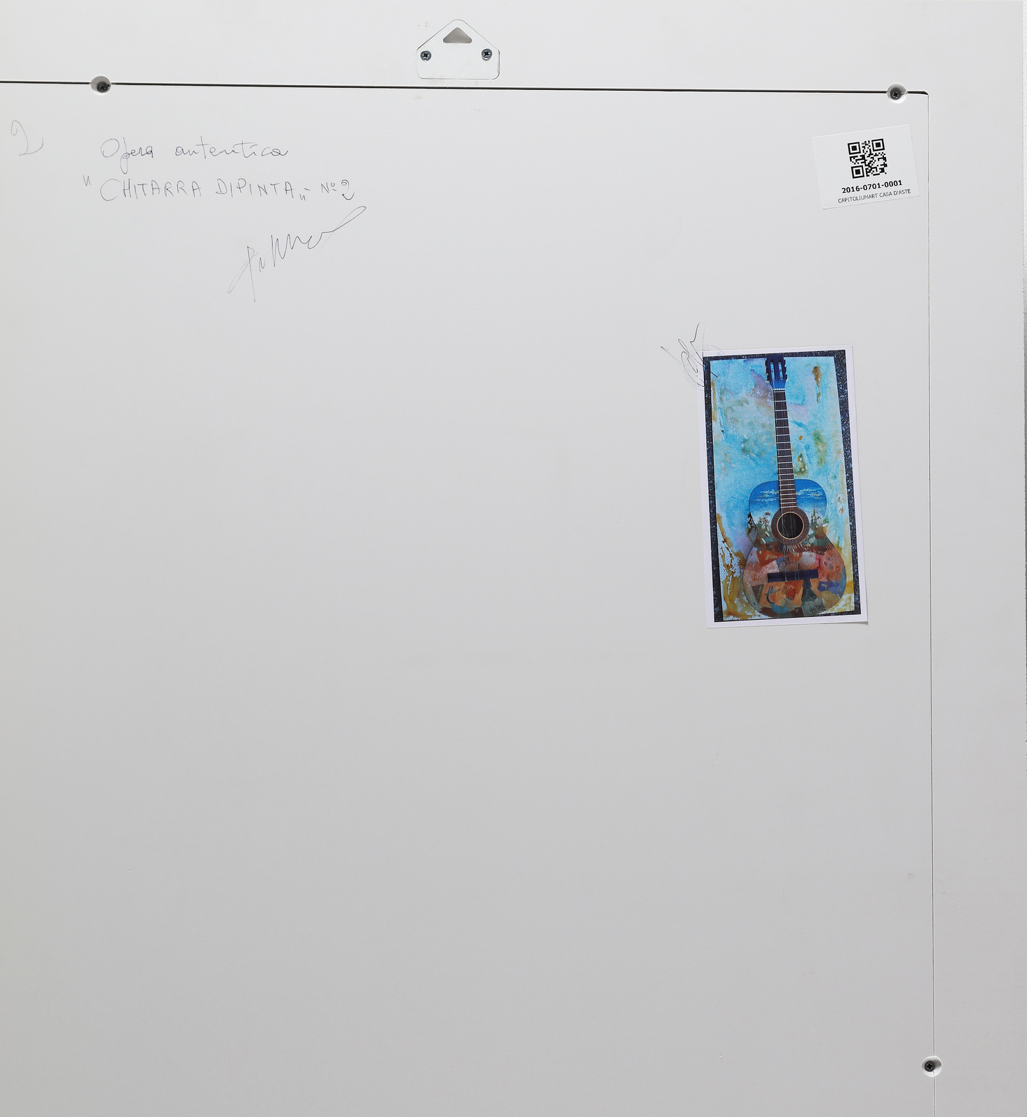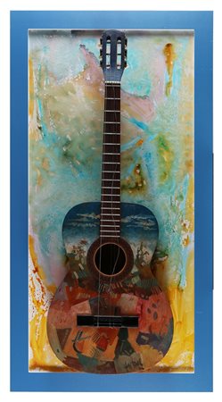 MANENTI DANILO (n. 1951) Chitarra dipinta n. 2. . tecnica mista collage su tavola. Cm 52,00 x 111,00 x 17,00. Firma in basso a destra. Al retro titolo e firma per autentica. L'opera è in una teca di plexiglass. Teca un po' sbeccata in alto.