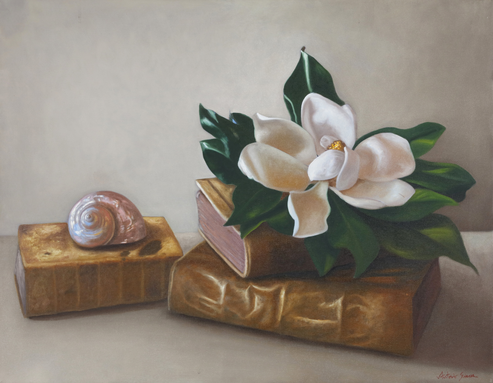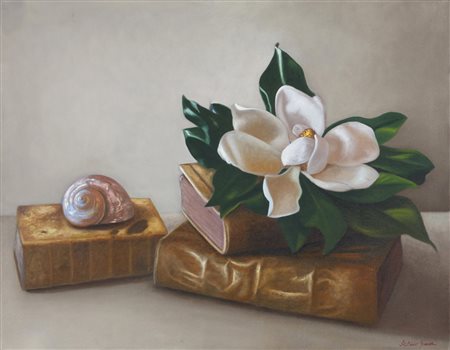 SCIACCA ANTONIO (n. 1957) Books and magnolia. Oil on canvas . Cm 90,00 x 70,00. Signature lower right. At the back title and signature. Artist’s authenticity certificate on photo.