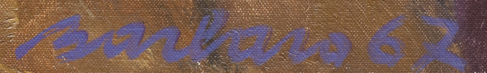 BARBARO SAVERIO (n. 1924) Arabic blue background. 1967. Oil on canvas . Cm 80,00 x 100,00. Signature and year lower right. At the back title, signature, year and Maison Franco, Nice stamp.