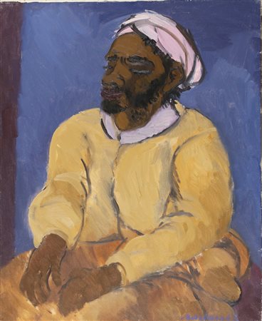 BARBARO SAVERIO (n. 1924) Arabo fondo celeste. . 1967. Olio su tela . Cm 80,00 x 100,00. Firma e anno in basso a destra, Al retro titolo, firma, anno e timbro a cura di Maison Franco, Nizza.