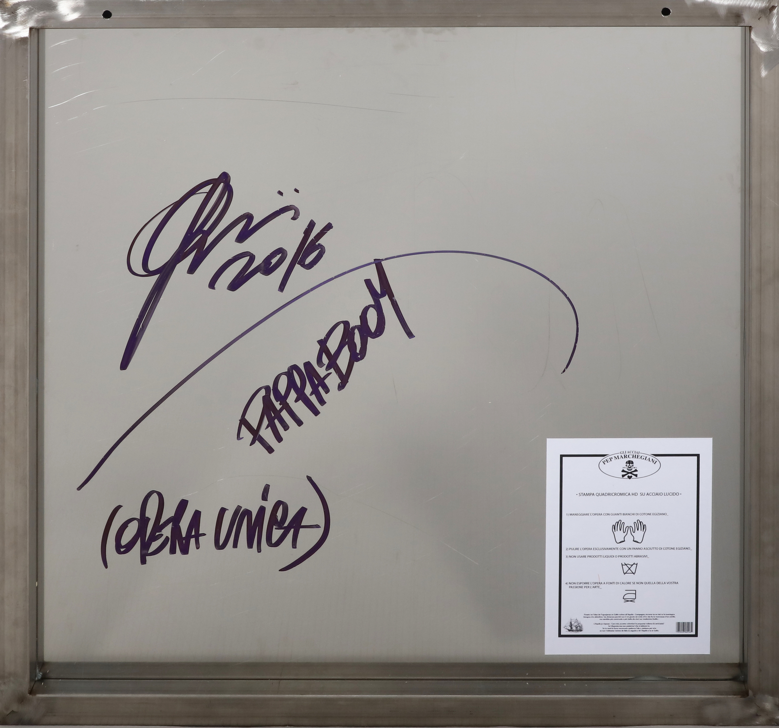 MARCHEGIANI PEP (n. 1971) Pappaboom. 2016. Serigrafia su lastra di acciaio. Cm 70,00 x 70,00. Opera unica. Al retro titolo, firma e anno. Autentica dell'artista su fotografia.