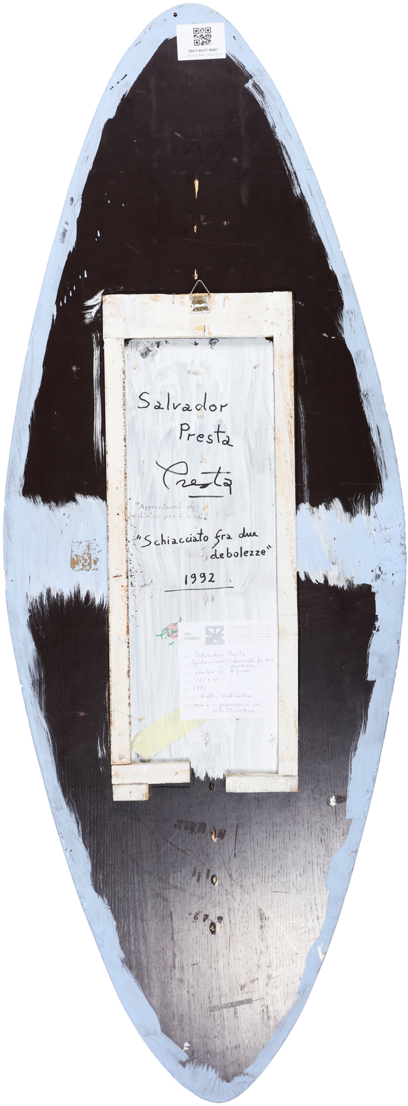 PRESTA SALVADOR (n. 1925) Crushed between two weaknesses. 1992. Mixed nomes on board. Cm 45,00 x 122,00. At the back title, signature, year and Arte Struktura, Milan label. Small defects.