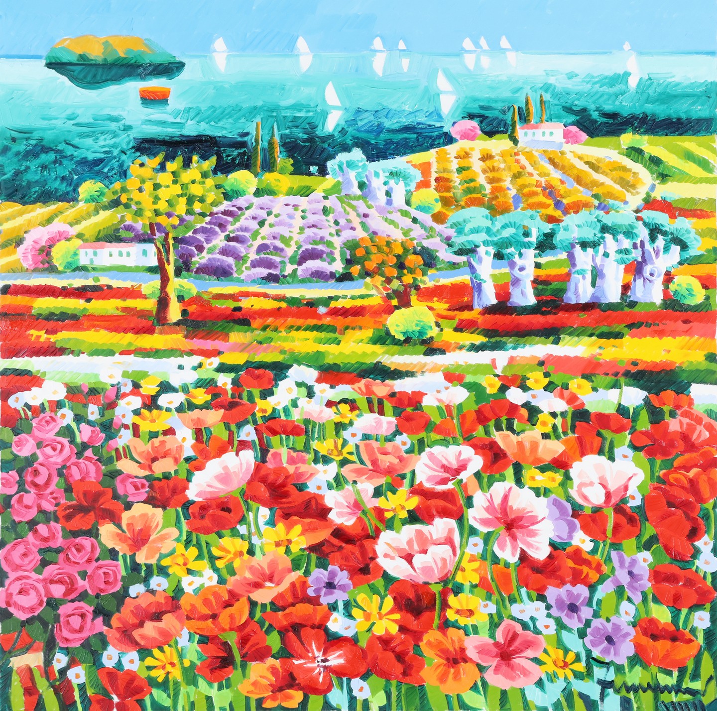 FACCINCANI ATHOS (n. 1951) E là tra i papaveri, ecco le case bianche. . Oil on canvas . Cm 80,00 x 80,00. Signed lower right. Artist's authenticity certificate on photo.