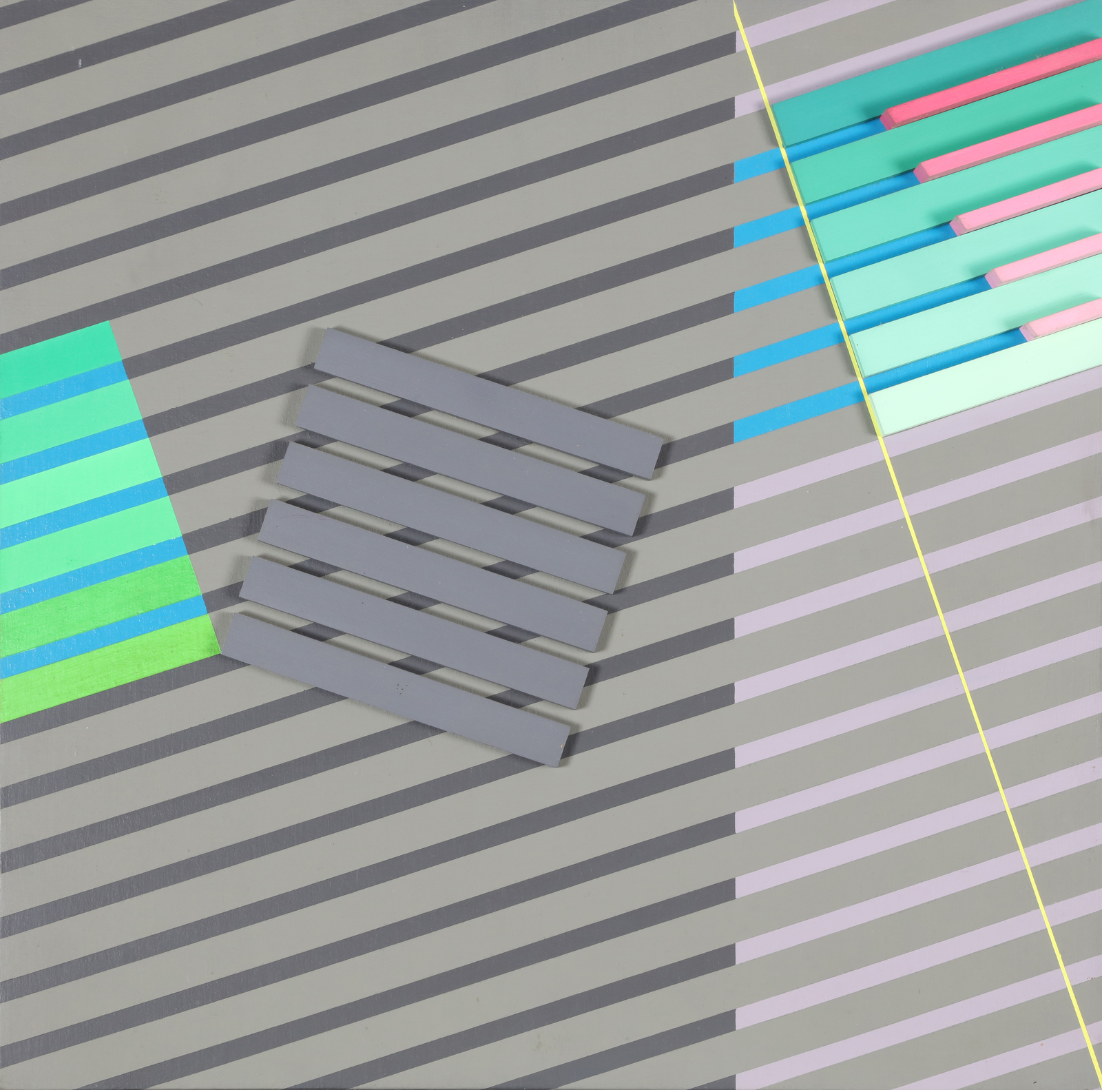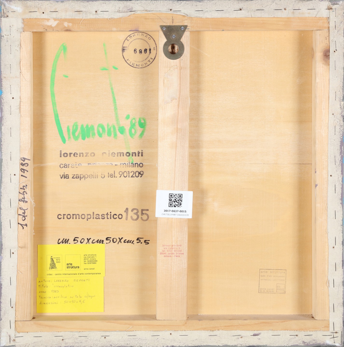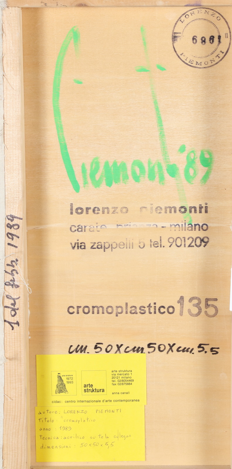 PIEMONTI LORENZO (n. 1935) Cromoplastico 135. 1989. Tecnica mista su tela su tavola. Cm 50,00 x 50,00 x 5,00. Al retro firma, anno, timbro dell'artista e cartiglio descrittivo con timbro Arte Struktura, Milano.
