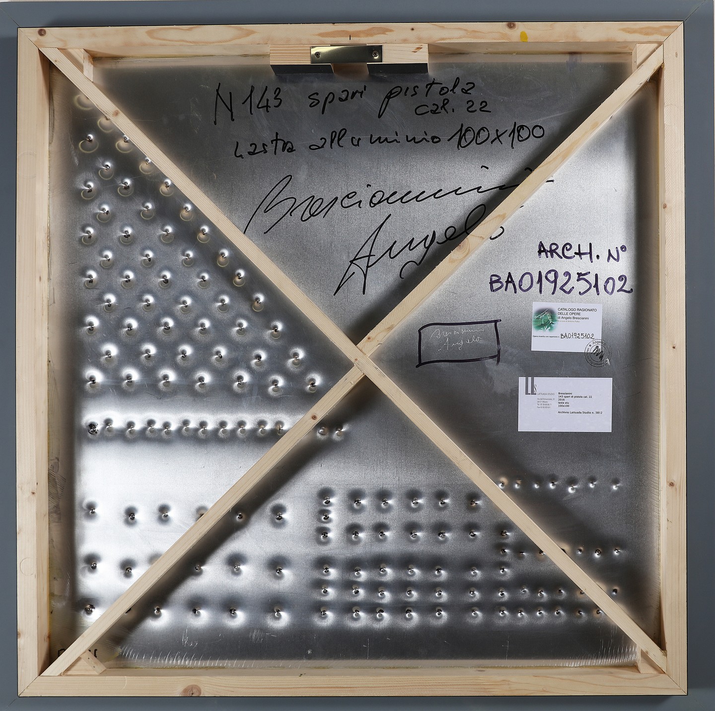 BRESCIANINI ANGELO (n. 1948) N.143 spari di pistola cal. 22. . Intervento su lamiera. Cm 100,00 x 100,00. Al retro firma, titolo, cartiglio dell Studio Lattuada, Milano e cartiglio del catalogo ragionato delle opere di Angelo Brescianini a cura di Antonio Falbo. Autentica dell'artista su fotografia. Pubblicazione: Antonio Falbo, Angelo Brescianini, a ferro e... fuoco, Edizioni Lattuada Studio, Milano, pp. 30 e 142.