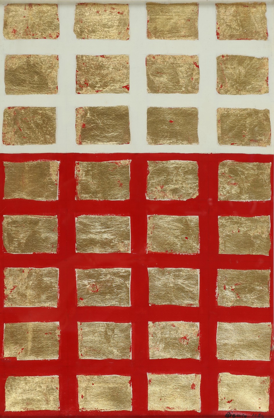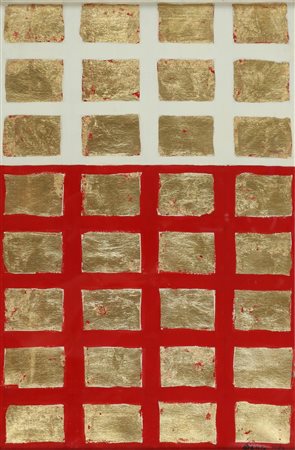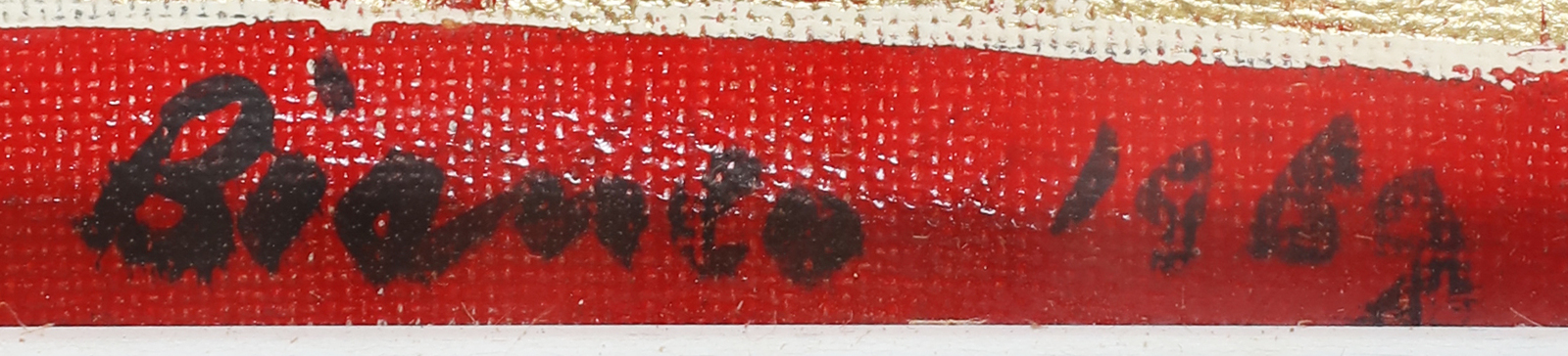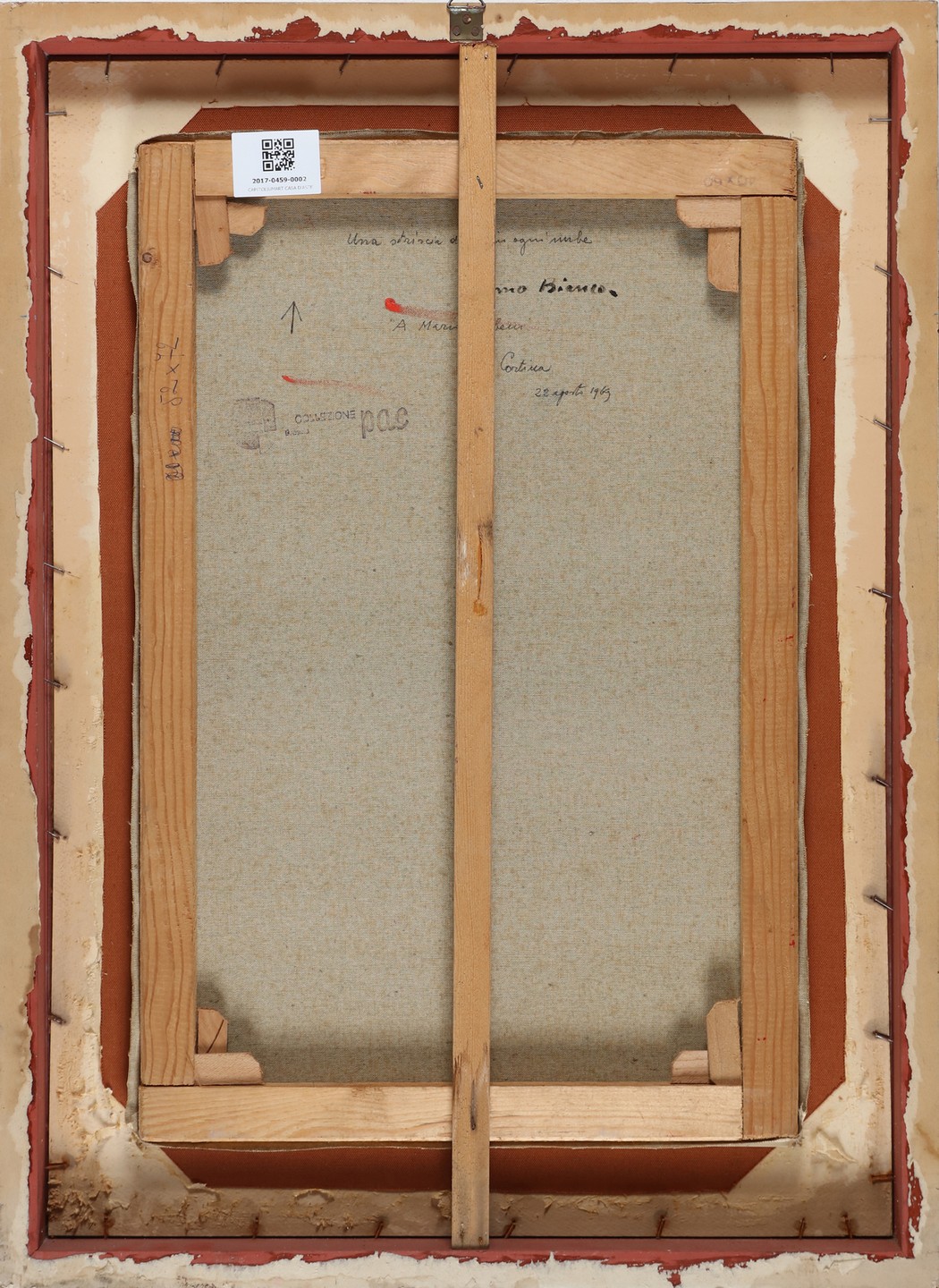 BIANCO REMO (1922 - 1990) Una striscia d'oro in ogni nube. 1969. Tecnica mista su tela. Cm 40,00 x 60,00. Firma e anno in basso a destra. Al retro titolo, firma, anno, dedica e timbro a cura della Collezione Pac, Brescia. Opera archiviata presso la Fondazione Bianco Remo, Milano come da documentazione allegata all'opera riportante il relativo numero d'inventario. La firma sul fronte non sembra autentica come riportato sull'archiviazione.. Cornice presente