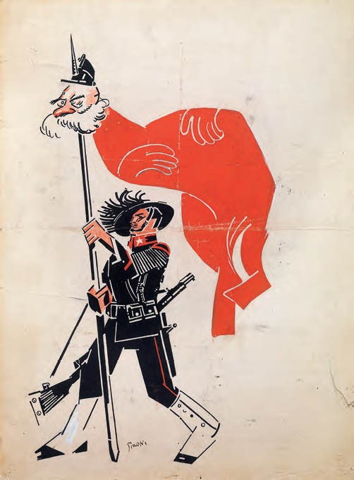 Mario Sironi Sassari 1885 - Milano 1961 Il bersagliere, 1915 Tempera e china su carta applicata su cartone, cm. 63,7x47,2 Firma in basso al centro: Sironi. Storia: Collezione Notari, Milano; Collezione privata Esposizioni: Mario Sironi. Tempere e disegni 1904-1960, presentazione di Fabio Benzi, Roma, Galleria Arco Farnese, 10 maggio - 30 giugno 2000, cat. pp. 20, 34, illustrato a colori. Illustrazione per il settimanale Gli Avvenimenti, n. 17, 25 aprile 1915, p. 3. Bibliografia: Andrea Sironi, Fabio Benzi, Sironi illustratore. Catalogo ragionato, De Luca Edizioni d'Arte, Roma, 1988, p. 35, n. 73.