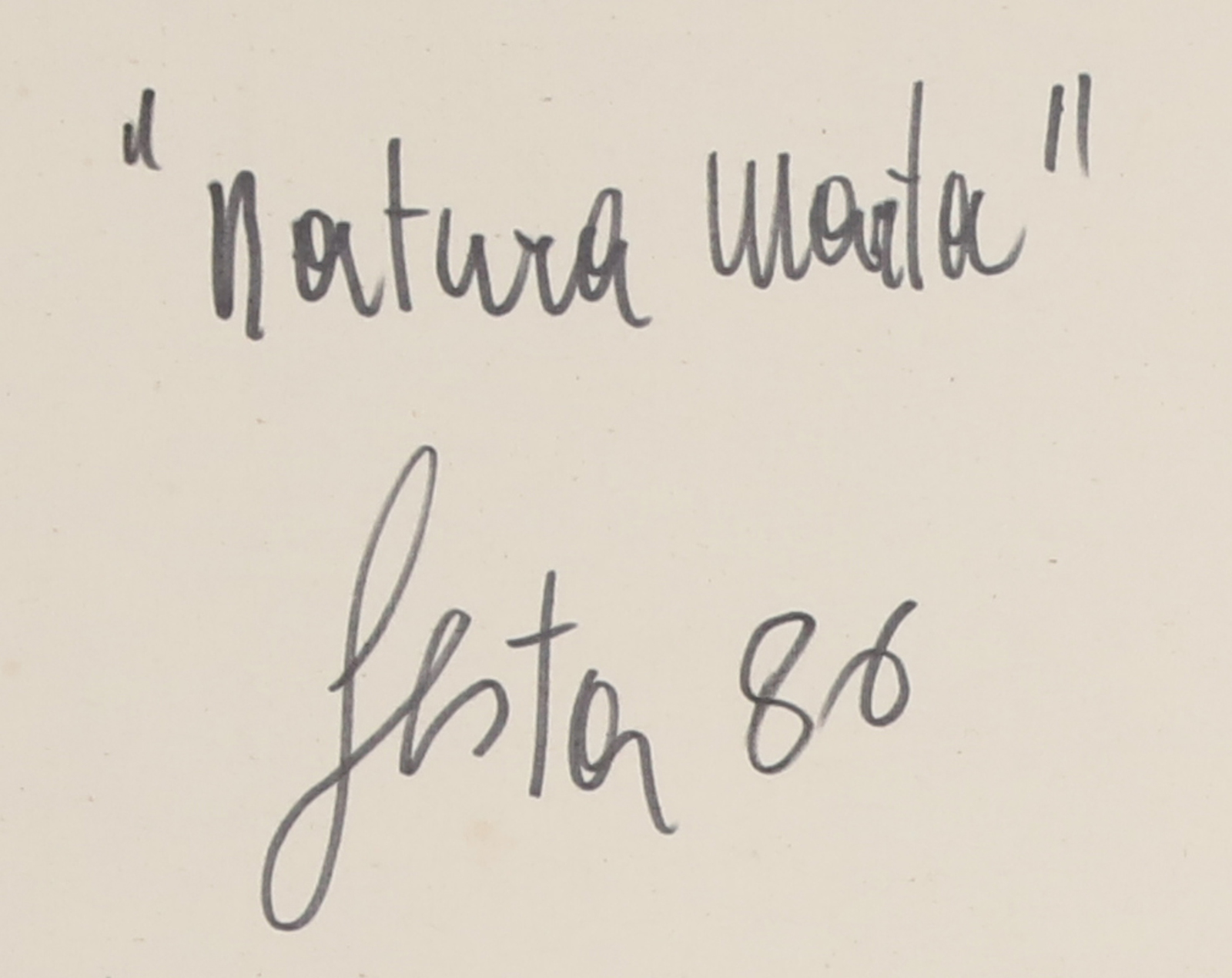 FESTA TANO (1938 - 1988) Still life. 1986. Acrylic on canvas. Cm 140,00 x 120,00. At the back title, signature and year. Tano Festa Archive - Studio Soligo, Rome authenticity certificate on photo. Provenance: Engema Arte, Nocera Inferiore (SA). Publication: Finarte Auction House, Florence, catalog auction, June 15, 1989, lot 78.