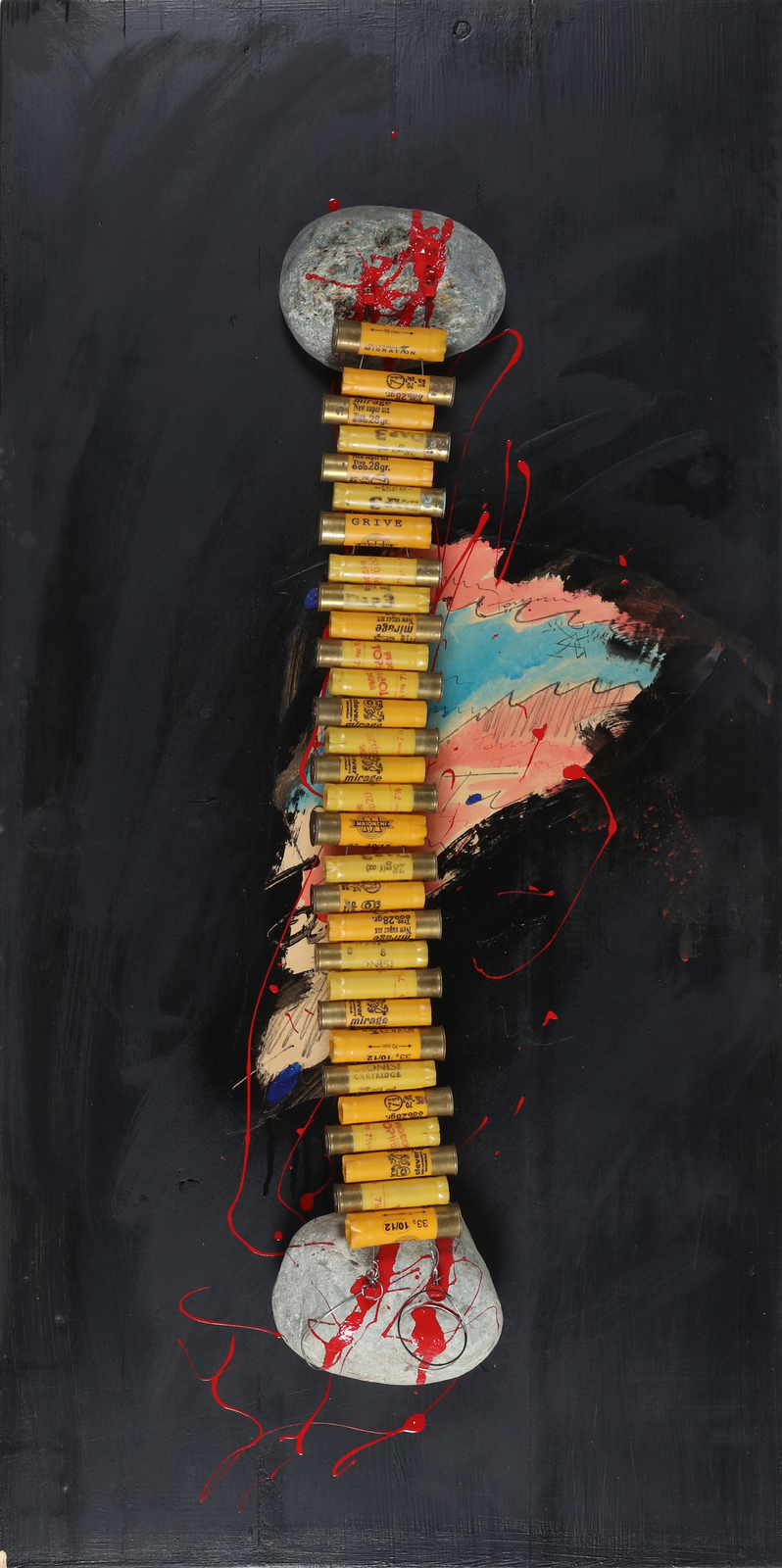 RE CARLO (n. 1954) Tamm tamm sotto il ponte giallo. 2004. Tecnica mista e assemblaggio. Cm 50,00 x 100,00. Pubblicazione: Carlo Re Pianeta libero a cura di Giovanna Barbero, Verso L'arte Edizioni, 2004, pag. 71.
