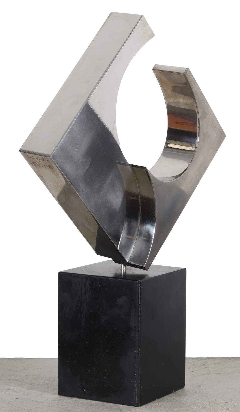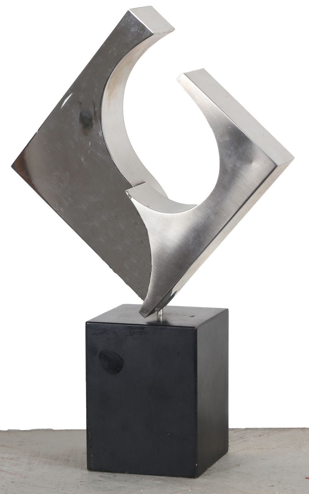 CAPPELLO CARMELO (1912 - 1996) Senza titolo. 1978. Acciaio. Cm 25,00 x 37,00 x 9,50. 49/99. Tiratura, firma e anno incisi. Base in legno. Dimensioni senza base: 25x24.5x4 cm.