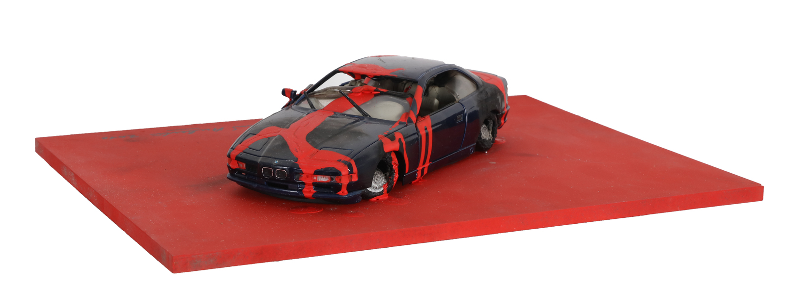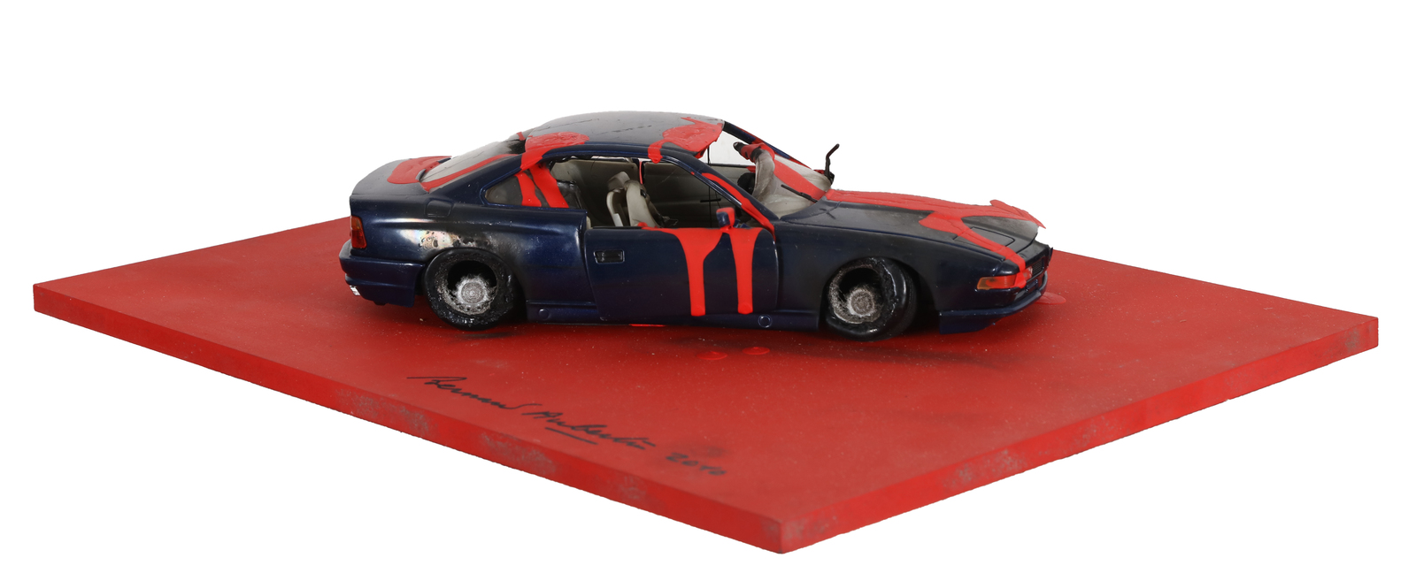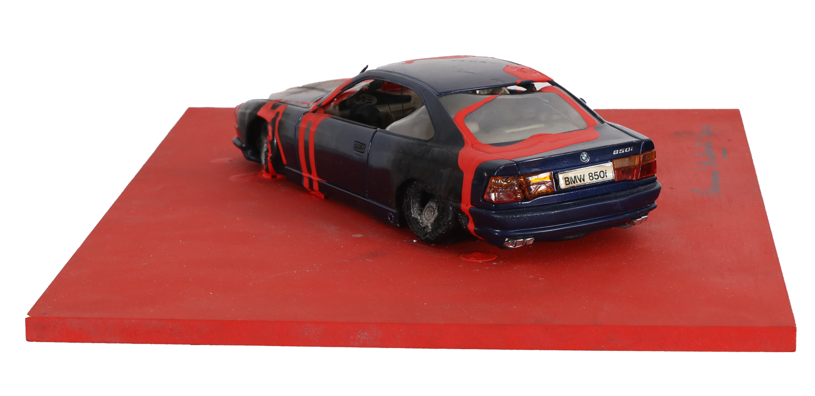 AUBERTIN BERNARD (1934 - 2015) Voiture bruleé. 2010. Mixed nomes on board. Cm 40,00 x 30,00 x 7,00. Signature and year lower right. Rosenberg Gallery, Milan authenticity certificate on photo. Publication: Exhibition catalog Bernard Aubertin - Voitures Dans le Feu, Bernard Aubertin archive, 2011, p. 133.