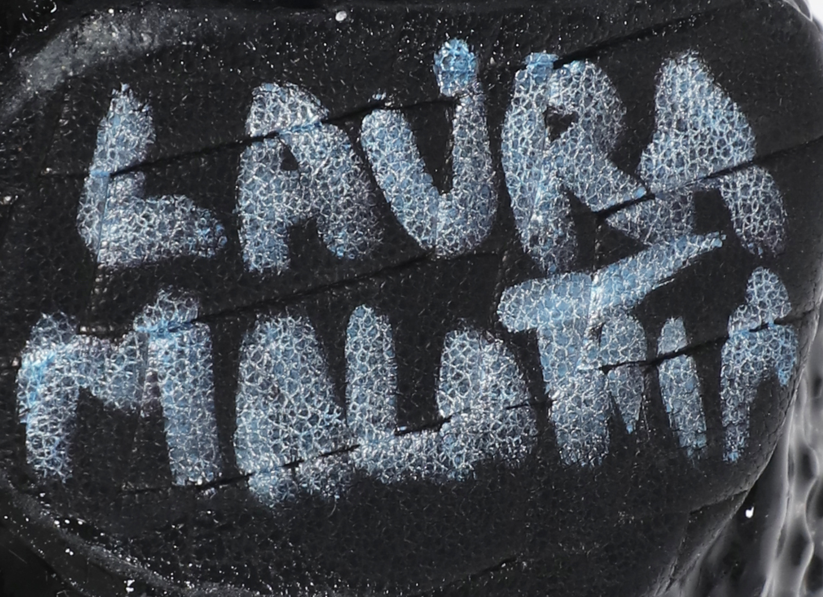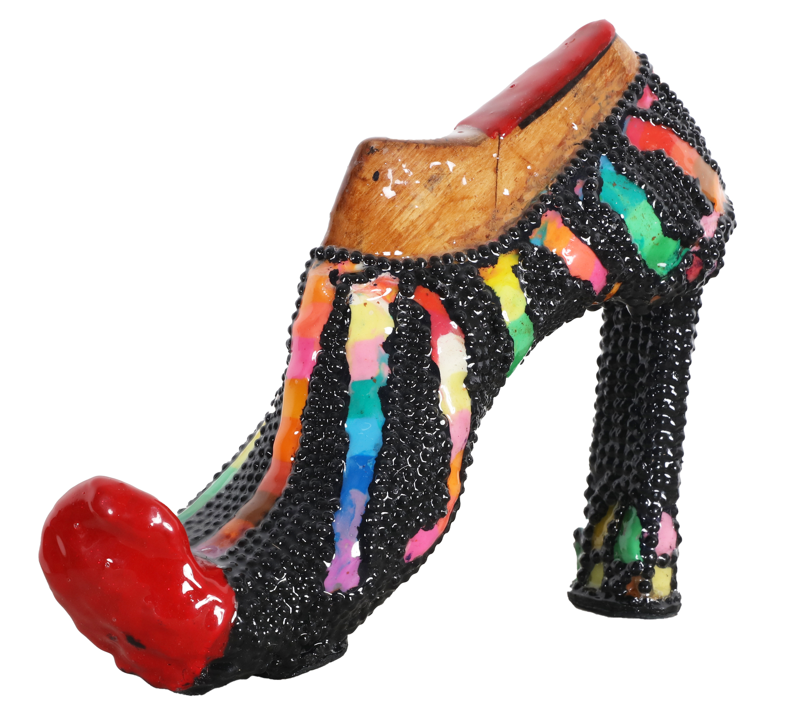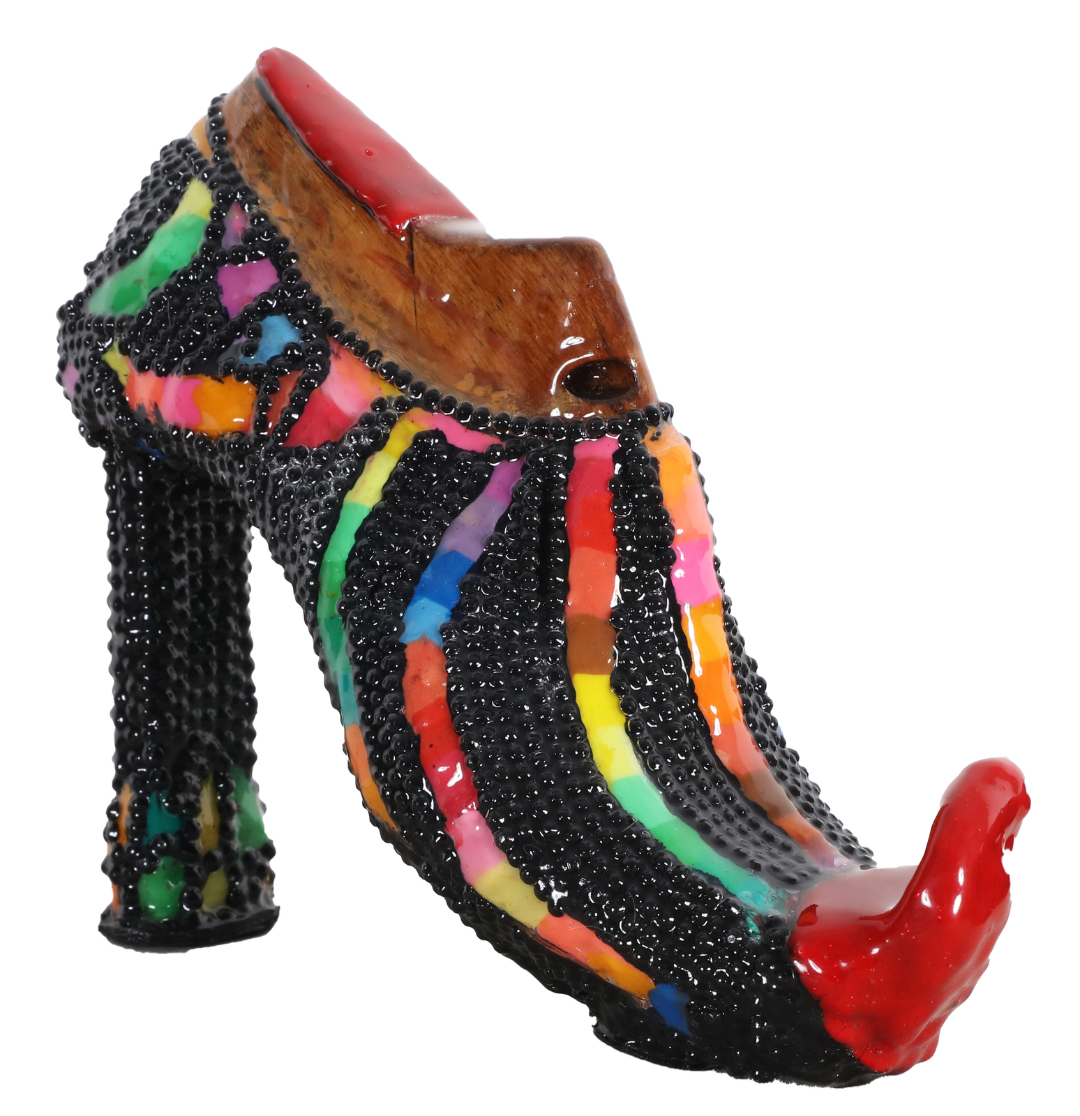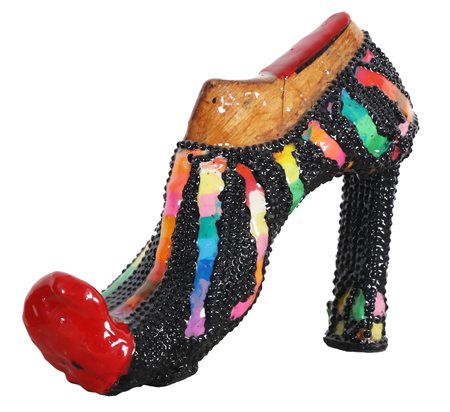 MALATTIA LAURA Scarpa. Lingua con lecca-lecca tutti i frutti. Legno, plastica. Cm 22,50 x 20,00 x 9,50. Firma alla base. Autentica dell'artista su fotografia.