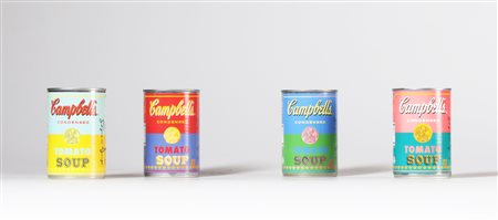 WARHOL ANDY (1928 - 1987) Campbell's soup. Cartone e lattine. Cm 7,00 x 10,50. Limited edition, 50esimo anniversario. Firma a stampa. Lotto composto da quattro lattine.